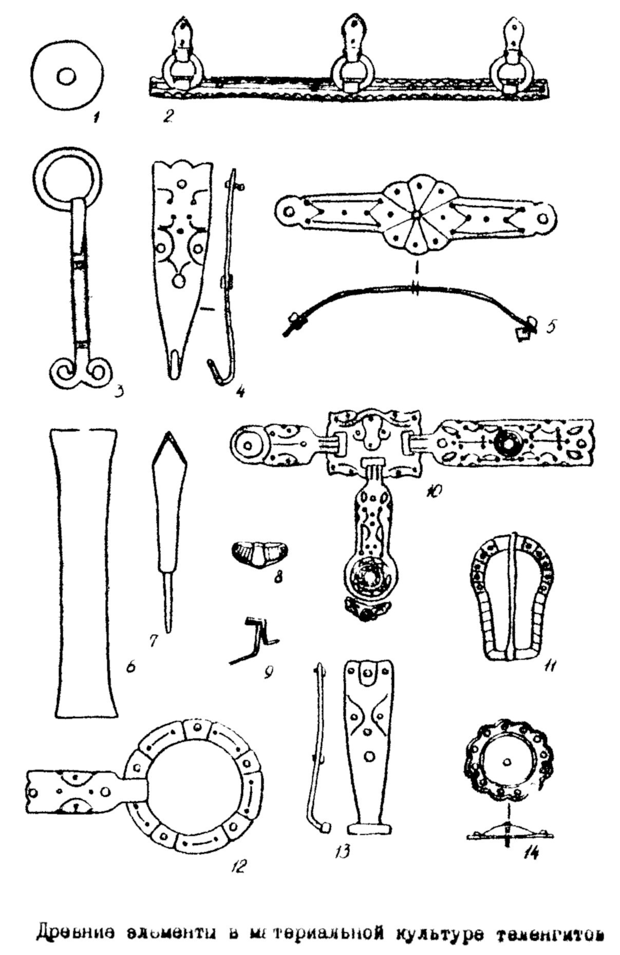 Следовательно, в материальной культуре теленгитов — предметах снаряжения верхового коня, женских украшениях и отдельных охотничьих атрибутах — выделяется целый ряд древних элементов, находящих себе ближайшие параллели в памятниках культуры Тувы и Минусинской котловины предмонгольского времени. Это подтверждает сообщение Рашид ад-Дина о переселении теленгитов (теленгутов), по-видимому, во второй половине XII — начале XIII вв. «по ту сторону страны (енисейских — Д.С.) киргизов», в процессе которого, вероятно достаточно длительном, ими были восприняты многие черты материальной культуры местных племён. Возможно, не случайно поэтому на территории самого Горного Алтая, местах современного расселения теленгитов, за исключением отдельных находок неизвестны археологические материалы, сопоставимые с рассмотренными выше древними элементами в культуре теленгитов. Можно предполагать, что они были принесены на Алтай далёкими предками теленгитов из соседних районов Центральной Азии и