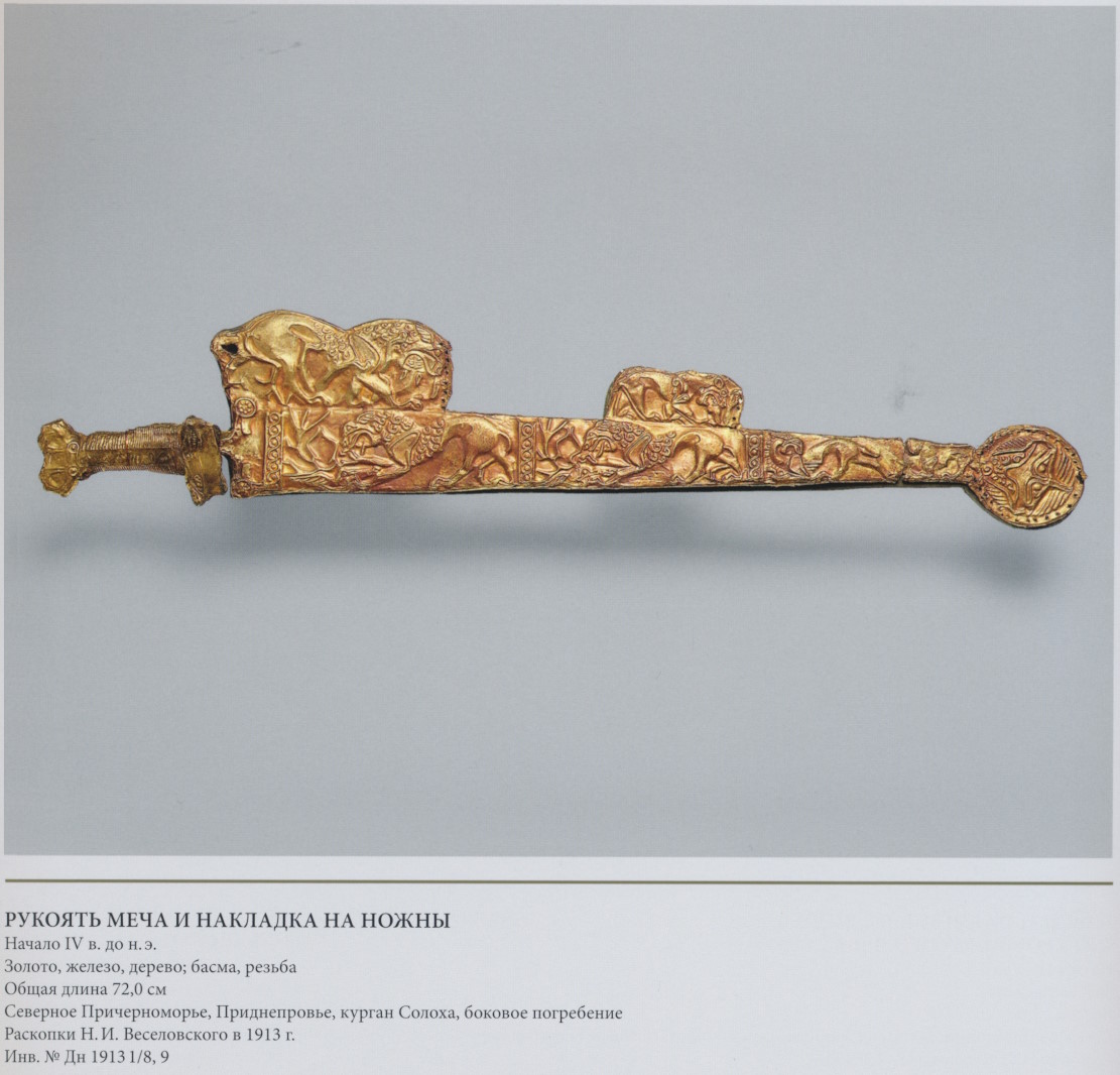 Меч с золотой рукоятью был обнаружен в одной из ниш основного погребального сооружения. В настоящее время не может быть сомнений в древнеиранском характере орнаментальных мотивов, композиций, стилистических особенностей его изображений. По форме рукояти и многочисленным аналогиям в ахеменидском изобразительном искусстве (Сузы, Персеполь, Амударьинский клад) можно предположить, что она была изготовлена в V в. до н.э. Отдельные мотивы, связывающие рукоять меча с искусством мидийской эпохи, такой датировке не противоречат. В Скифии в IV в. до н.э. был изготовлен новый железный клинок для ножен с изображениями батальных сцен.