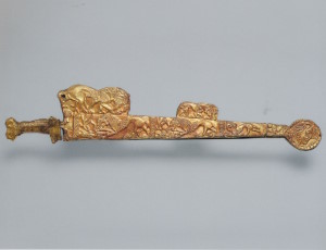 VII в. до н.э. Золото, гематит, янтарь, стеклянная паста; чеканка, пайка, ковка, выколотка, инкрустация. 16,2×32,6 см. Северо-Западный Кавказ, Закубанье, Первый Келермесский курган. Раскопки Д.Г. Шульца в 1903 г. Инв. №Ку 1903 2/1.