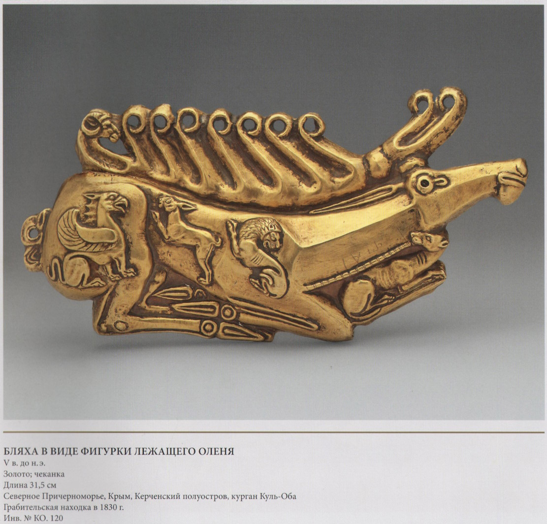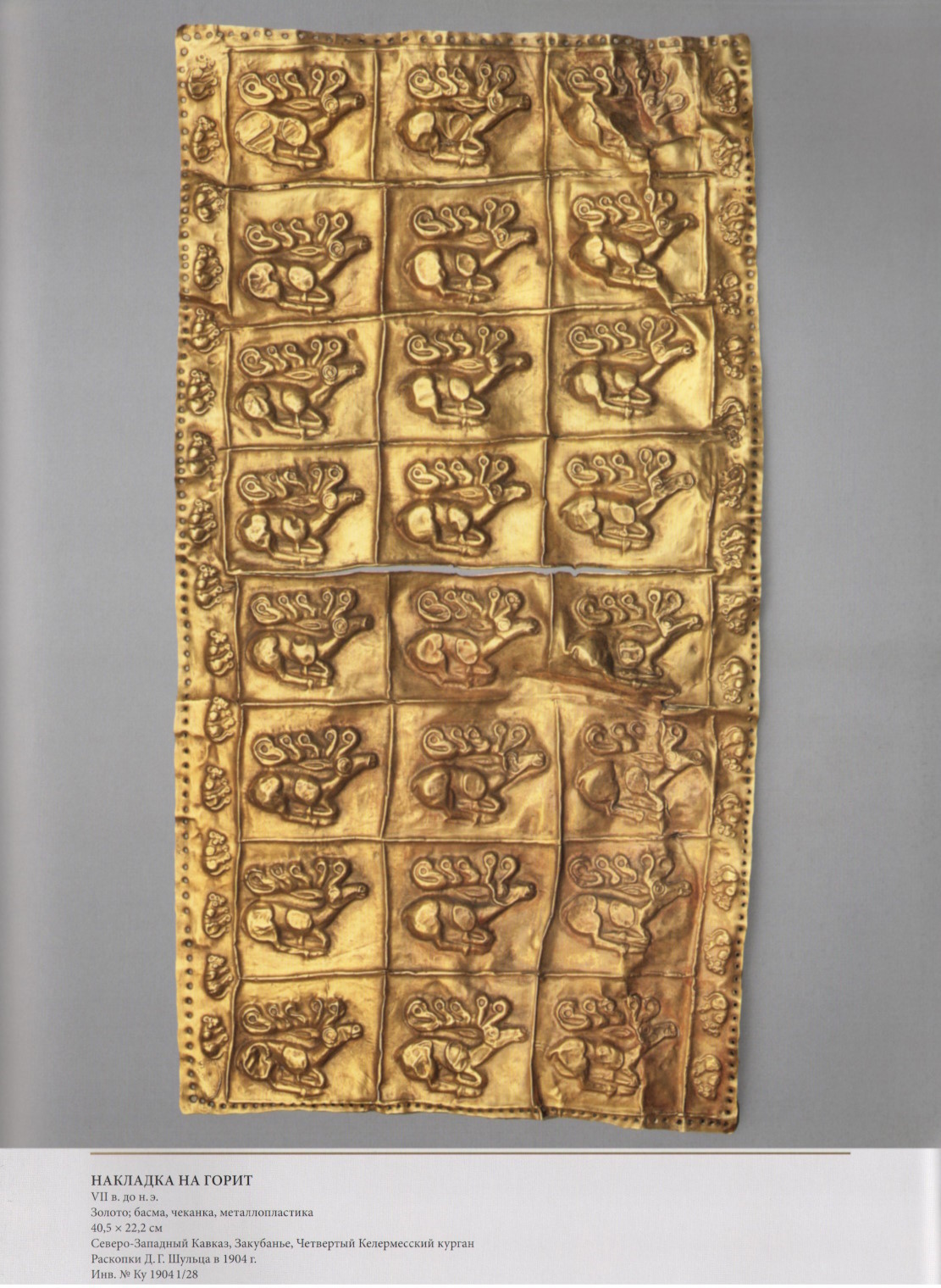 Конец VII в. до н.э. Золото; чеканка, пайка. 19,0×31,1 см. Северо-Западный Кавказ, Закубанье, Костромской (Первый Разменный) курган. Раскопки Н.И. Веселовского у станицы Костромская в 1897 г. Инв. № 2498/1. (Открыть илл. со стр. 64 в новом окне)