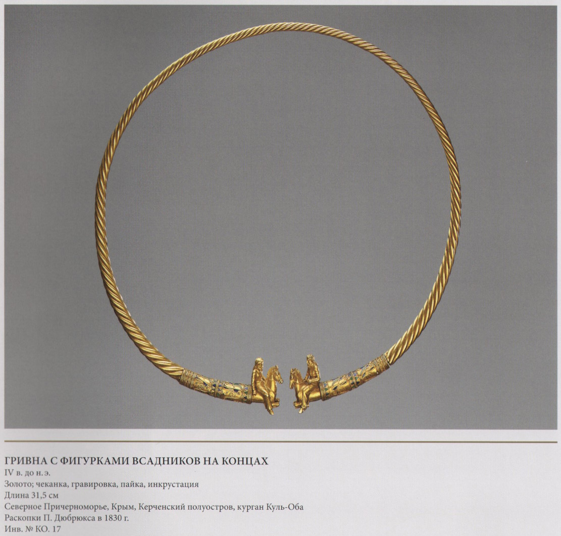 Гривна в ряду скифских шейных украшений выглядит необычной благодаря скульптурным наконечникам, выполненным в виде всадников. Подробно проработаны лица, детали одежды и конского снаряжения. Очевидно, что греческий ювелир, изготовивший гривну, ориентировался на будущего владельца, которым стал один из скифских владык.