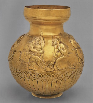 Вторая половина IV в. до н.э. Золото, вытяжка, басма (?), гравировка, пайка, чеканка. Высота 13,0 см. Северное Причерноморье, Крым, Керченский полуостров, курган Куль-Оба. Раскопки П. Дюбрюкса в 1830 г. Инв №КО.11. (Открыть илл. со стр. 192 в новом окне)
