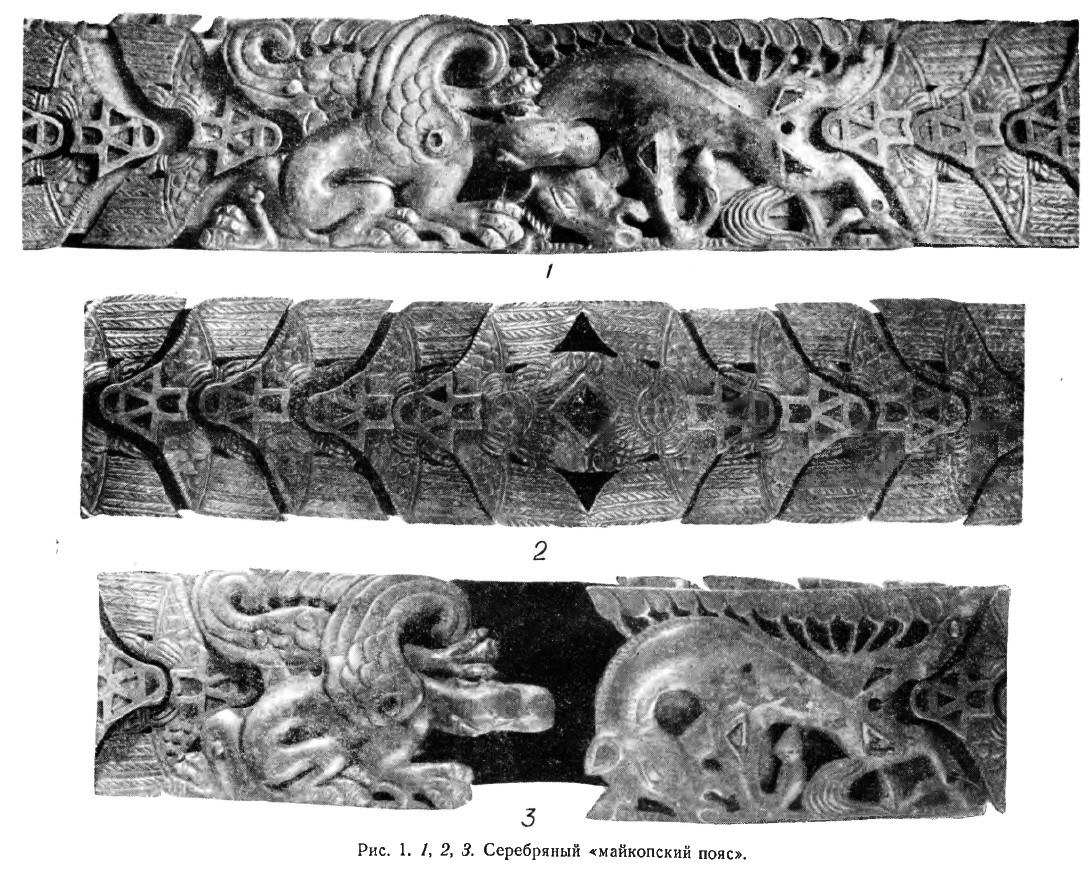 Как бы то ни было, в специальной литературе «майкопский пояс» прочно занял место одного из ярких образцов древнего скифо-сарматского искусства, причём занимавшиеся им авторы высказывали весьма различные точки зрения как по вопросу о месте его изготовления, так и по вопросу о его датировке. Эти колебания и расхождения во взглядах отнюдь не случайны. Они обусловлены характером самого предмета, крайне противоречивого стилистически и объединяющего элементы различного происхождения. Попытки разобраться в этом противоречивом единстве столкнулись с ещё большими трудностями после того, как стали известны свинцовые бляхи Одесского музея. Мы видели как опубликовавший их А. Салмони пытался преодолеть это затруднение. Однако решение вопроса пришло в другом направлении.