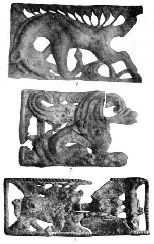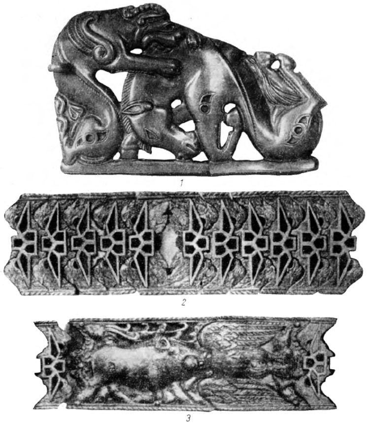 Рис. 2. 1 — Золотая пластина из Сибири; 2-3 — Серебряный пояс (Британский музей).