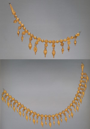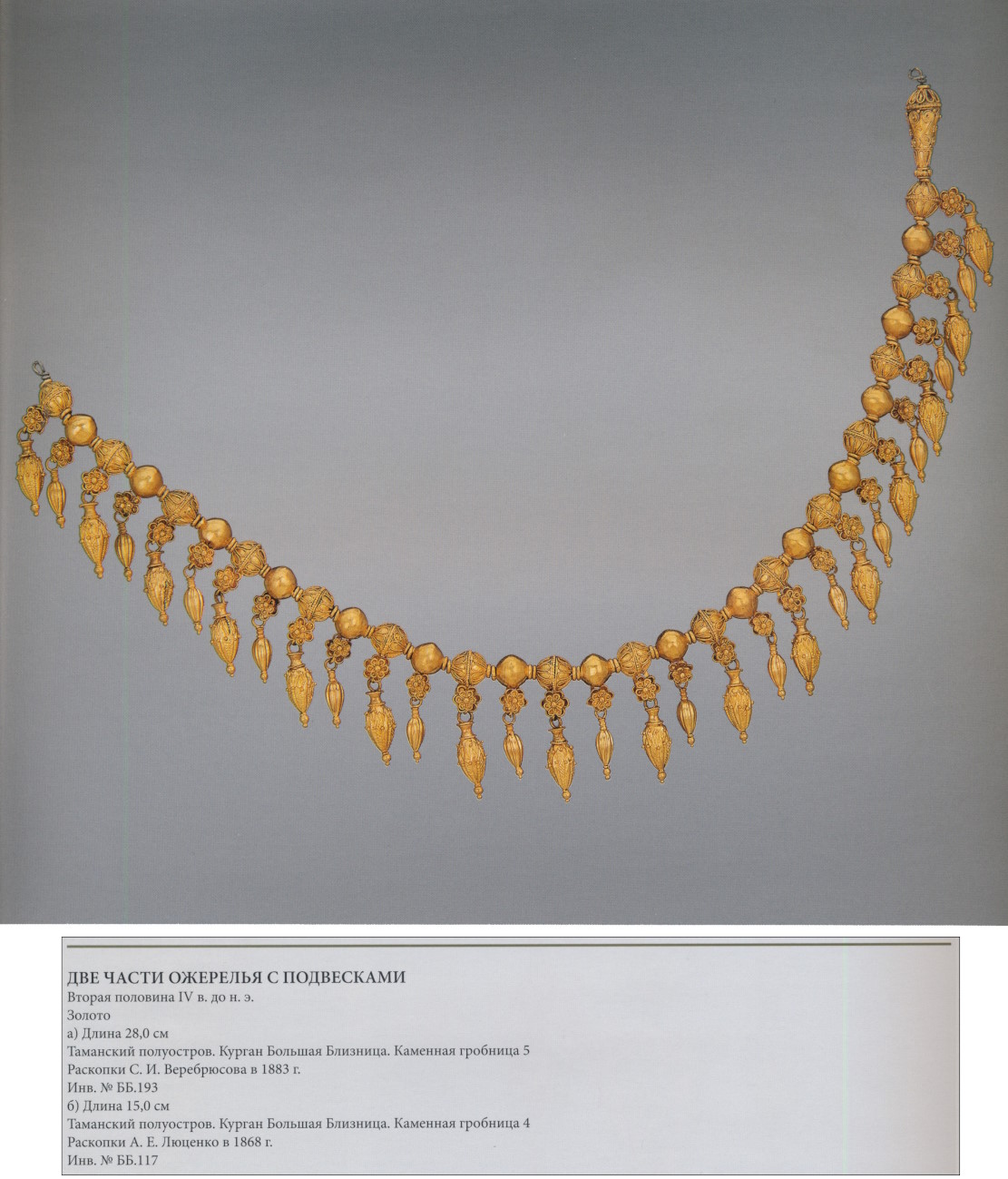 Ожерелье, нанизанное на две параллельные нити, как пронизи из Ольвии (с. 42), состоит из коробчатых пронизей, к которым присоединены зерновидные подвески (такие детали украшений можно рассматривать как символ благосостояния и плодовитости). Лицевая поверхность пронизей украшена дугами с волютами из зерни и филигранной розеткой с лепестками, заполненными синей и зелёной эмалью. Два звена с тиснёными пальметками служат окончаниями ожерелья.