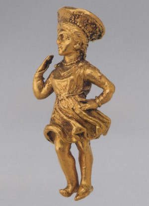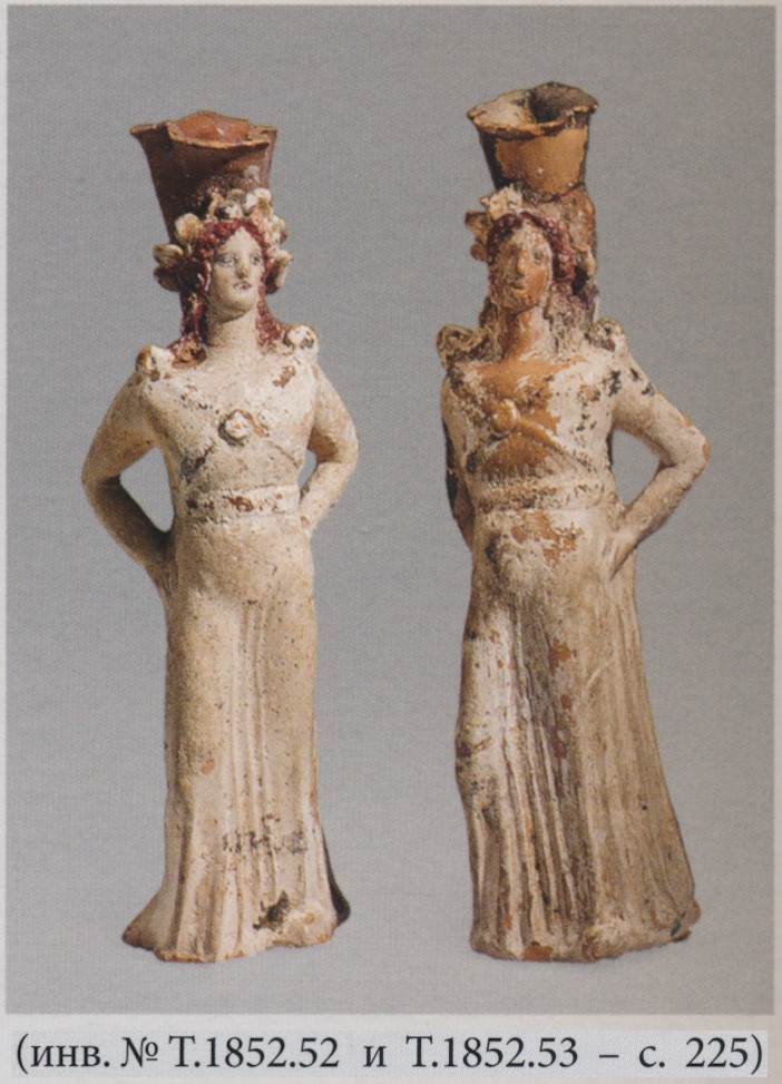 Миниатюрные скульптуры несколько угловаты и непропорциональны, но тщательно отделаны: мастер постарался передать облик сказочных обольстительниц. Конечно, эти фигурки были не только олицетворением кокетства, но и расчётом на помощь таких устрашающих персонажей в противодействии злым силам. Серьги найдены вместе с ожерельем (с. 220).