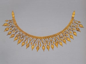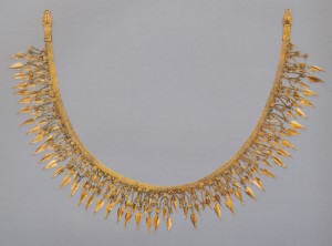 Круглый шнур ожерелья составлен из соединённых между собой цепочек из звеньев двойного переплетения, оканчивающихся втулками с головами львов. На одной из них хорошо виден шов между тиснёными половинками. В центре украшения — гераклов узел, сплошь покрытый филигранными спиралями с шариком зерни в середине. Узел обрамлён четырьмя спиралями из рубчатой проволоки. Застёжкой ожерелью служили ныне утраченный крюк и кольцо в пастях львов. Изделие пострадало от огня погребального костра. В том же склепе было найдено и другое шейное украшение с геракловым узлом (с. 210).