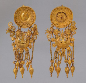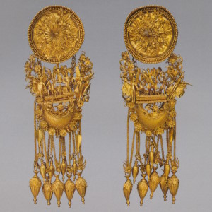Пара серёг с дисками, украшенными розетками и филигранью, к которым подвешены фигурки крылатой Гебы с кувшином и фиалой в руках. Фигурки литые, руки с сосудами, крылья и плащ изготовлены отдельно. Геба, богиня юности, дочь Зевса и Геры, на пирах богов подносила нектар (до того как эти обязанности Зевс поручил похищенному им Ганимеду):