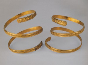 Спиральный браслет в виде свернувшейся змеи спаян из двух полосок золотого листа: внутренней гладкой и наружной профилированной. На голове змеи — пустое гнездо от выпавшего в древности камня. Чешуя показана чеканкой только на голове и хвосте змеи, тогда как её тело представлено в виде полосы с тремя продольными рёбрами, характерными для плоских браслетов несколько более раннего времени (с. 100, 194); в данном случае такой приём, вероятно, позволял избежать натурализма.