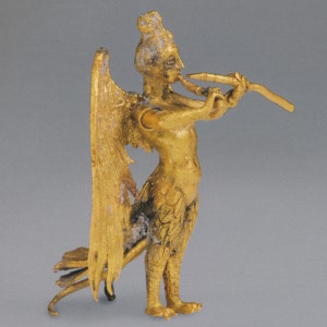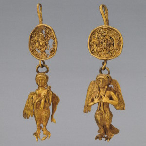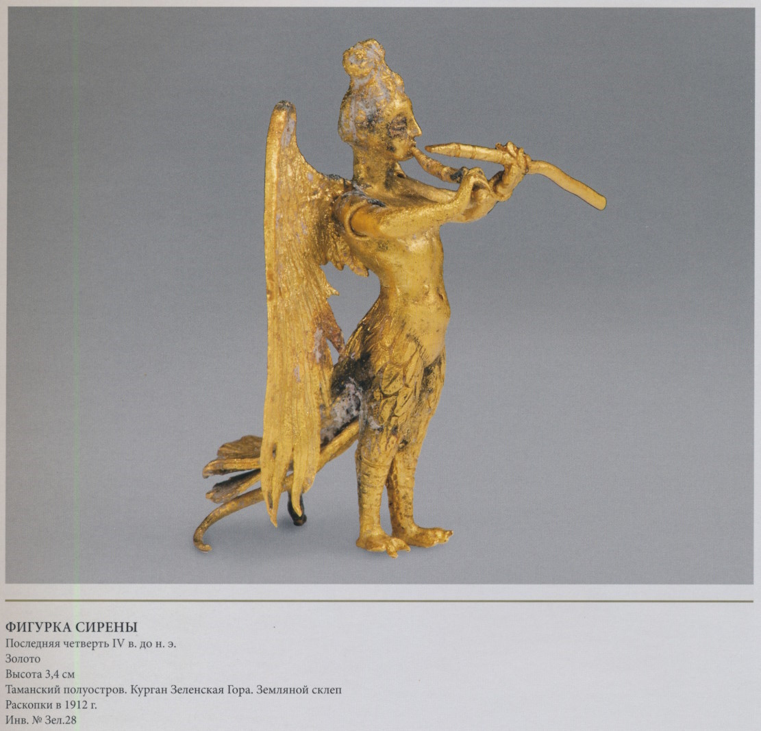 Серьги с диском, украшенным филигранью, и с подвесками в виде фигурок сирены, одна из которых играет на двойной флейте, как сирена из кургана Зеленская Гора (с. 200), а другая — на кифаре. Фигурки составлены из оттиснутых в матрицах отдельных частей, спаянных вместе. Детали изображений: волосы, черты лица — переданы гравировкой, а перья на крыльях — пуансоном. На обратной стороне левой серьги древний мастер прикрыл заплатой стерженёк, удерживающий крыло. Эта серьга, пострадавшая от огня погребального костра, подверглась реставрации в XIX в.: внутрь фигурки вставлен поперечный золотой стерженёк, а в левую ногу — деревянная шпилька.