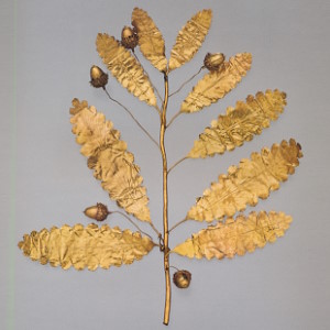 Ветка с листьями и желудями представляет собой часть погребального венка из каштанолистного дуба, произрастающего в Малой Азии и на Кавказе. Среди многочисленных венков, хранящихся в Эрмитаже, эта ветка выделяется тщательностью проработки деталей, что особенно заметно в исполнении чешуек на шляпках желудей. Бо́льшая часть венка, добытого грабителями и проданного в частные руки, ныне хранится в Вашингтоне, в Смитсоновском институте (Уильямс, Огден 1995. С. 179. Рис. 54).