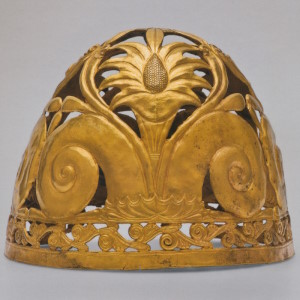 Полуяйцевидный корпус этого условного головного убора образован сочетанием массивных волют, листьями аканфа и цветами семейства ароидных. Снизу композиция обрамлена полосой растительного узора, а сверху расположена розетка с отверстием в центре. Головным убором его позволяют считать размеры, пропорции и соотношение длины и ширины нижней части. Он изготовлен выколоткой, составные части узора вырублены по контуру (на кромках заметны зазубрины от ударов инструмента), детали проработаны чеканкой.