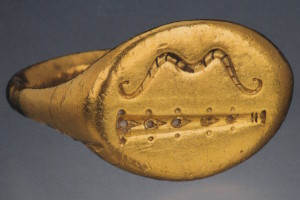 Перстень-печать с вырезанным изображением атрибутов Геракла — лука и палицы. Композиция почти полностью воспроизводит обратную сторону золотых монет македонских царей Филиппа II и его сына Александра Великого. Изображения Геракла и его атрибутов, весьма частые на их монетах, служили прославлению династии. Так царский дом Аргеадов, возводивший свой род к потомкам Геракла, напоминал о легендарном предке, подтверждая своё эллинское происхождение.