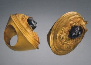 В богатом погребении у скелета женщины среди прочих вещей лежали восемь массивных перстней, в том числе два с погрудным рельефным изображением Афины с маской Медузы Горгоны на чешуйчатом панцире; на одном перстне — с лёгким поворотом головы, на другом — почти в фас. Голова, вырезанная из альмандина, обрамлена, как оправой, рельефом щитка, на котором воспроизведены шлем и панцирь богини. Детали рельефа переданы тиснением, чеканкой и гравировкой. Это самые ранние камеи из найденных в Северном Причерноморье, кроме того — один из первых примеров внедрения цветного камня в декор греческих ювелирных изделий.