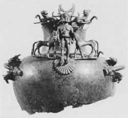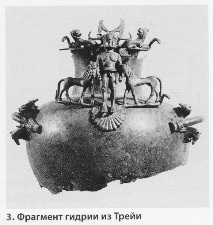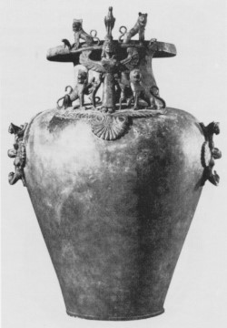 Правда, некоторые импорты, обнаруженные в ареале гальштатской культуры, относятся к довольно раннему времени. Так, ойнохои из Вильсингена и Каппеля датируются последней третью VII века до н.э. Гидрия из Грехвиля (кантон Берн, Швейцария) высотой 57 см, найденная в кургане с трупосожжением, была изготовлена в одной из греческих колоний в Италии в 580-570 годах до н.э. [16] Особенно замечательна её ручка в виде крылатой повелительницы зверей, окружённой четырьмя львами и увенчанной орлами и змеями (ил. 2). В руках богиня держит зайца, символ плодовитости. [17] Аналогичные сосуды найдены в Трейи и датируются 565-550 годами до н.э. (ил. 3). Гидрии из Грехвиля и Трейи можно рассматривать как результат эксперимента спартанских мастеров по бронзе, на которых оказали влияние резчики по слоновой кости и изготовители терракотовых рельефов для больших глиняных ваз. [18] Таким образом, вполне вероятно, что роскошные винные приборы экспортировались в варварские регионы не только из Массалии, но и из некоторых других регионов Великой Греции. Этрусские кубки, также встречающиеся в Средней Европе, были созданы в пределах VI века до н.э. или после 525 года до н.э. Фрагментарный характер археологических источников не позволяет говорить о значительном потоке импортных изделий в это время.