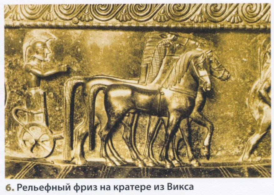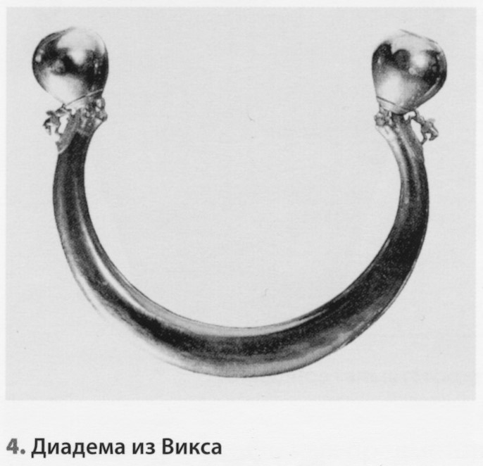 Аристократические погребения, как и резиденции нобилей, также часто содержали импорты средиземноморского происхождения. В большом кургане в Виксе (диаметр 42 м, высота 6 м), раскопанном в 1953 году поблизости от Монт-Лассуа, на кузове повозки покоилась тридцатипятилетняя женщина с золотой диадемой и множеством других украшений — браслетов, фибул, ожерелий из янтаря и т.п. Четыре колеса повозки были прислонены к восточной стене могилы. Этот транспорт использовался как похоронные дроги и является особенностью элитных погребений позднего гальштата. Вес диадемы, или торквеса, украшавшего голову усопшей, — 480 г, его окончания оформлены в виде львов, когтями сжимающих шары, и фланкированы крылатыми конями, выполненными в ориентализированном стиле (ил. 4). Диадема может быть произведением греко-этрусского искусства, но, поскольку ничего подобного в классическом мире неизвестно, она, по-видимому, была изготовлена на заказ с учётом «варварского» вкуса или действительно сделана местными мастерами. Две аттические чернофигурные чаши (обе датируются между 525 и 500 годом до н.э.), бронзовый кубок, две импортные бронзовые кастрюли и упомянутые выше привозные и местные украшения входили в сопроводительный инвентарь погребённой. Наиболее поразителен в данном комплексе бронзовый кратер — сосуд для вина, смешанного с водой, который попал в Массалию из Лаконии или Тарента, а уже оттуда — в курган в Виксе. Его высота превышает 1,6 м, весит он 208 кг (ил. 5). Верхняя часть кратера декорирована фризом с изображениями пехотинцев и колесниц, запряжённых четвёркой лошадей (ил. 6), ручки заканчиваются петлями в виде головы Медузы. Крышка кратера украшена женской фигурой. [19]