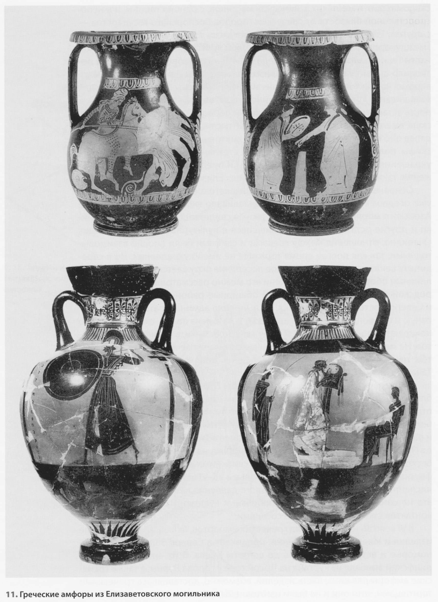 савроматских и меотских этнических массивов, с одной стороны, и в непосредственной близости от греческих городов Боспорского государства — с другой, Елизаветовское поселение сделалось главным центром оптовой «международной», а также межплеменной торговли всей юго-восточной части Геродотовой Скифии. Исследование Елизаветовского городища позволило выявить основные механизмы зарождения и развития греко-варварских контактов и взаимоотношений. Были найдены свинцовые гири для взвешивания товаров и склады винной тары, объем которой даёт возможность установить, что в течение всего IV и первой половины III века до н.э. сюда ежегодно могло поступать до трёх тысяч и более декалитров вина; далее оно вывозилось в другие районы внутренней Скифии. Помимо вина, скифы получали востребованные ими стеклянные и пастовые женские украшения, греческую керамику (ил. 11) и предметы престижного вооружения, также обнаруженные в погребениях Елизаветовского некрополя. [23]