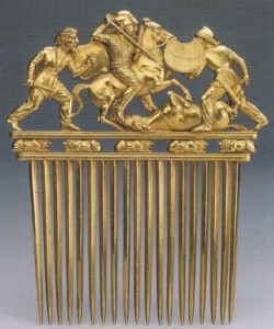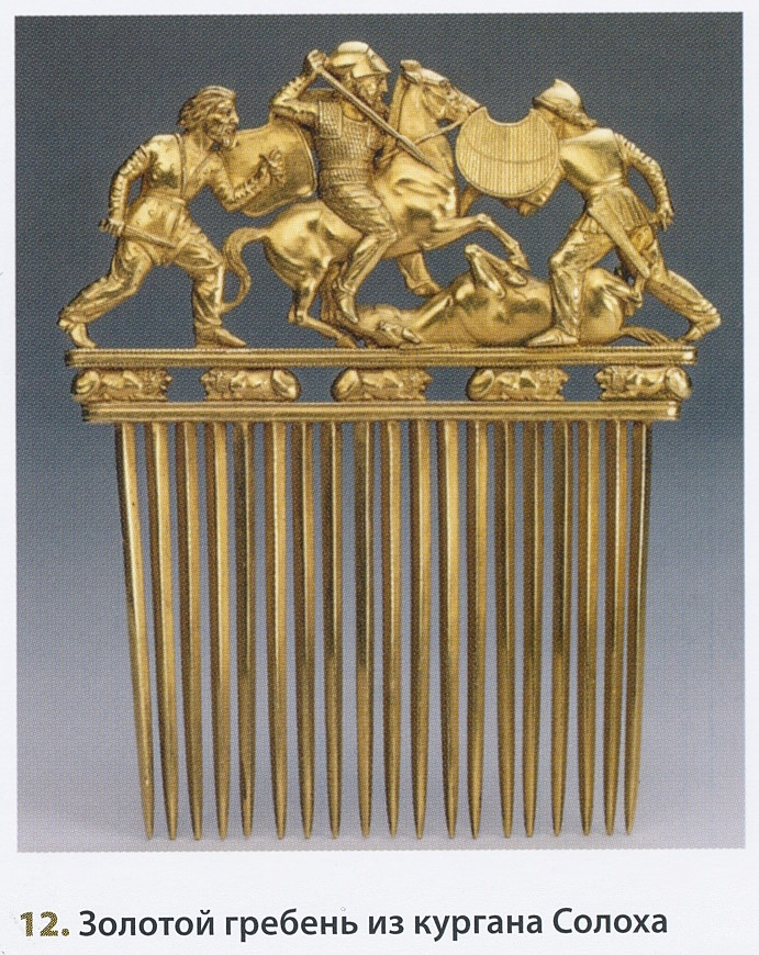 кургана Солоха, изготовленный в одном из греческих полисов, скорее всего в Ольвии (ил. 12). Он был найден во впускной могиле кургана и лежал возле плеча или черепа царя. Эта могила датируется 400-375 годами до н.э. и рассматривается как предполагаемая гробница скифского царя Октамасада, о ком можно почерпнуть некоторые сведения в «Истории» Геродота. [26] У скифского царя Ариапифа, помимо Октамасада, было ещё два сына — Скил и Орик. Скил, сын истриянки (то есть фракиянки), сделался эллинофилом и унаследовал царство после смерти отца. Осуждённый скифами за участие в Дионисийских мистериях, Скил бежал во Фракию к своему дяде, царю Ситалку, но последний выдал его Октамасаду (или выслал из страны). По мнению А.Ю. Алексеева, батальная сцена на гребне из Солохи повествует именно о заключительном эпизоде «дворцового переворота», когда братья Октамасад (на коне) и Орик (пеший) нападают на изгнанного Скила, фракийско-эллинские пристрастия которого греческий торевт подчеркнул фракийским шлемом и греческим панцирем с пельтой и без горита. [27] Существуют и другие интерпретации этой