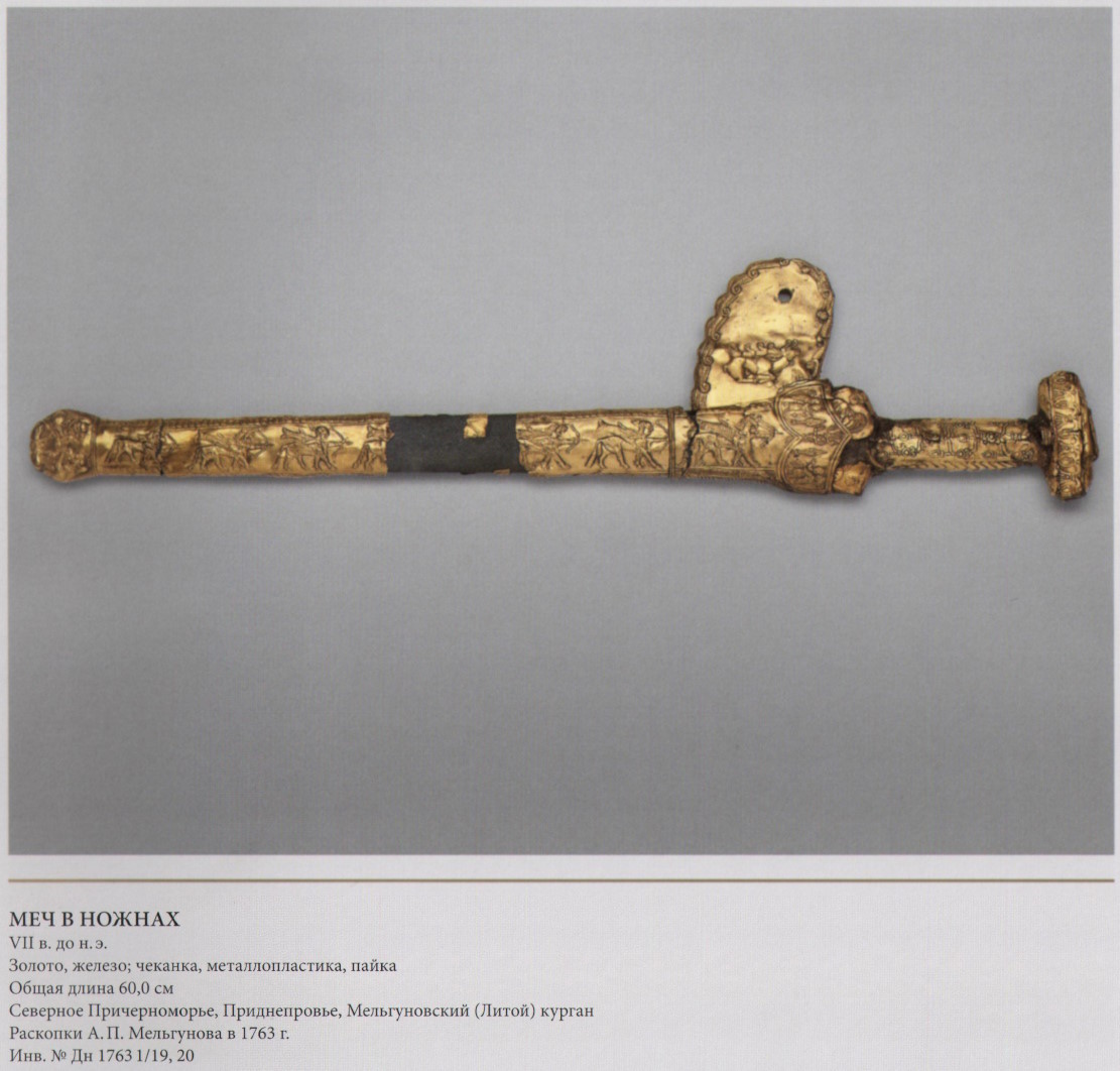 VII в. до н.э. Золото, железо; чеканка, металлопластика, пайка. Общая длина 61,0 см. Северо-Западный Кавказ, Закубанье, Первый Келермесский курган. Раскопки Д.Г. Шульца в 1903 г. Инв. №Ку 1903 2/2.