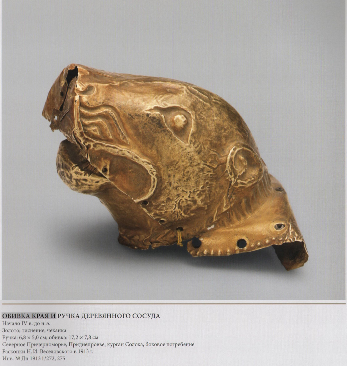 Диск: середина V в. до н.э.; обкладка ручки: IV в. до н.э. Золото, серебро, бронза, ковка, чеканка, басма. Диаметр диска 15,5 см; длина 31,5 см. Северное Причерноморье, Крым, Керченский полуостров, курган Куль-Оба. Раскопки П. Дюбрюкса в 1830 г. Инв. №КО.9. (Открыть илл. со стр. 177 в новом окне)