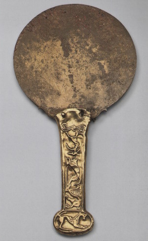 Характерно, что ручка зеркала очень близка по форме и декору рукоятям некоторых скифских парадных мечей. Это явление вообще оказывается характерным и для предскифского, (176/177) и для скифского времени, так как известно несколько типов зеркал, рукояти которых повторяют форму рукоятей мечей. Вероятно, это связано с тем, что зеркало в Древнем мире тоже могло считаться оружием, но не обычным, а магическим.