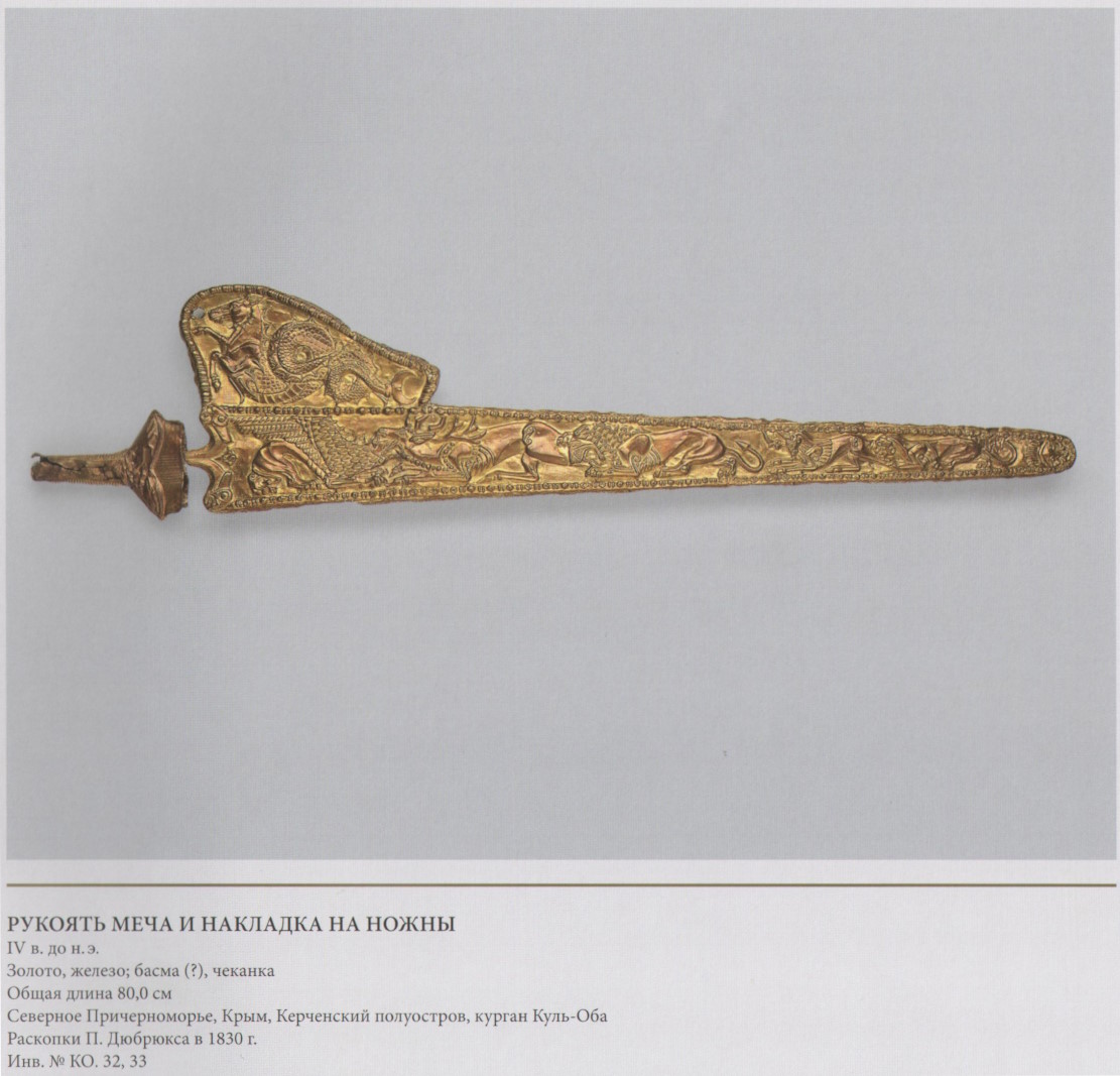 V в. до н.э. Золото; чеканка. Длина 31,5 см. Северное Причерноморье, Крым, Керченский полуостров, курган Куль-Оба. Грабительская находка в 1830 г. Инв. №КО.120.