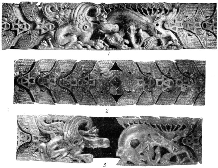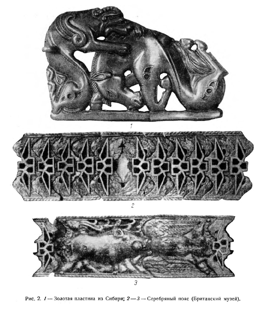 Рис. 2. 1 — Золотая пластина из Сибири; 2-3 — Серебряный пояс (Британский музей).