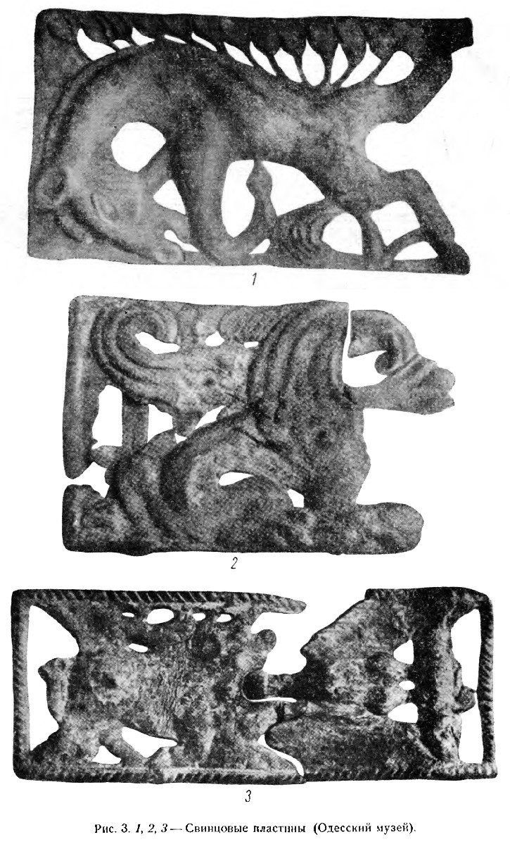 «Две свинцовые пряжки с фигурами животных», будто бы найденные в Ольвии, были куплены музеем в 1912 г. за 1 р. 50 к. у неназванного лица. [36] Это несомненно описанные выше пластины с изображениями коня и грифона, композиционная связанность которых тогда не могла быть очевидной.