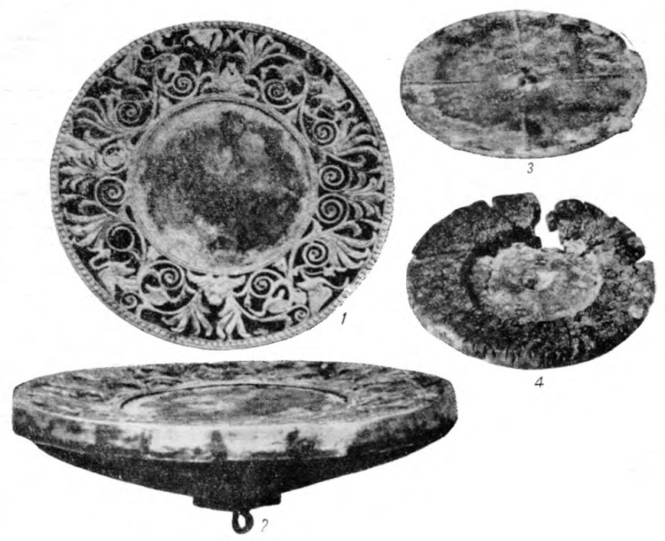 [35] 1 Нельзя не обратить внимания на приведённые в публикации зеркала Хмелиовского аналогичные находки зеркал с серебряными золочёными крышками в музеях Венском, Брюссельском и Британском (G. Richter and С. Alexander, ук.соч., стр. 225-226 и табл. XLVI и XLVII). Все они приобретены у торговцев древностями и происходят якобы из «Южной России» (первые два) и из Болгарии (последнее). Не имея возможности судить о подлинности накладных крышек этих зеркал, отметим, что в раскопках подобные изделия, насколько известно, до сих пор не встречались. С другой стороны, в отношении Брюссельского зеркала указано, что бронзовая оправа его задней стороны и гвозди оказались новыми.