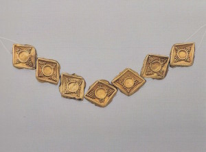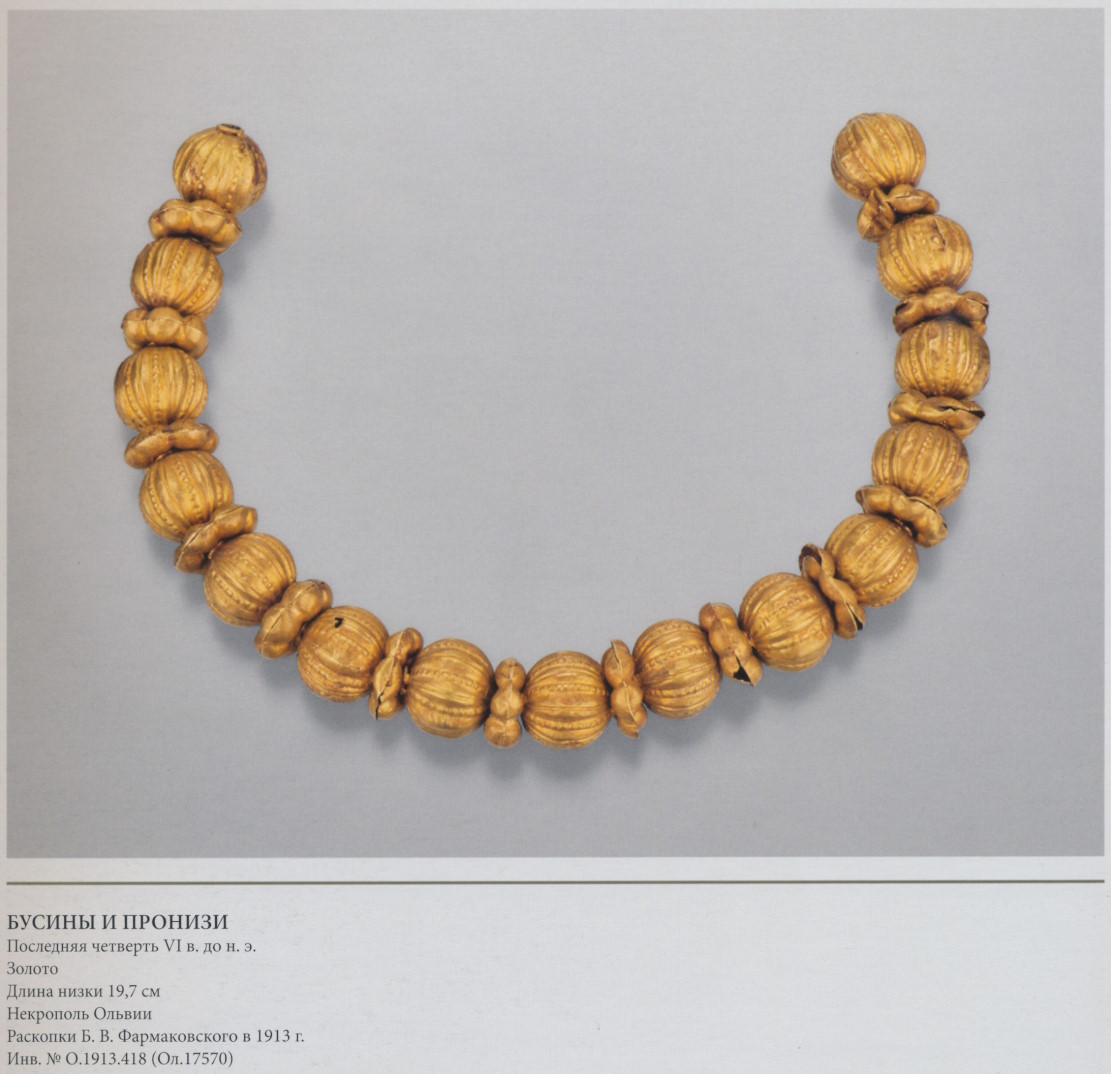 Последняя четверть VI в. до н.э. Золото. Длина низки 19,7 см. Некрополь Ольвии. Раскопки Б.В. Фармаковского в 1913 г. Инв. №O.1913.418 (Ол.17570)
