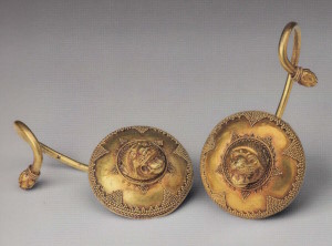 Один из ранних образцов серёг с розеткой и фигурной подвеской. Крючок скрыт двухслойной розеткой с лепестками, обрамлёнными рубчатой проволокой, к нему снизу свободно подвешена фигурка Пегаса, спаянная из двух тиснёных половинок. Ноги, крылья и хвост коня изготовлены отдельно и припаяны к туловищу. Этой подвеской открывается галерея миниатюрной скульптуры в украшениях, в которой наиболее интересными оказываются литые фигурки (лучшие из них — с. 68, 98, 112, 154).