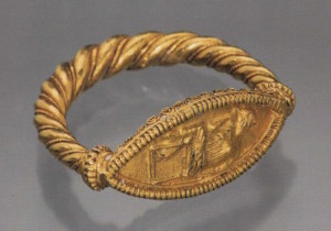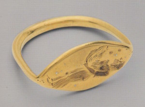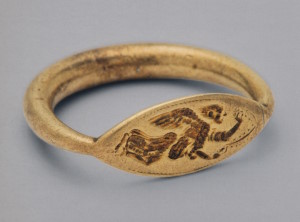 Кованый перстень с резьбой на щитке: стоящая Даная приподнимает подол хитона, ловя капли дождя. Скованность движения её фигуры, усиленная трактовкой складок одежды параллельными штрихами, позволяет отнести печать к произведениям строгого стиля.