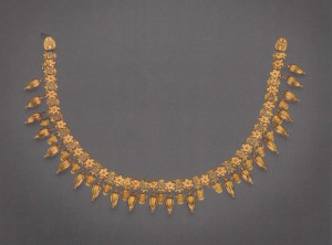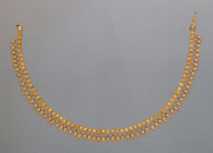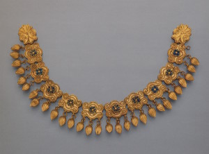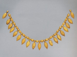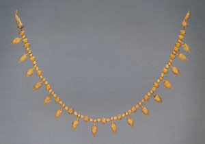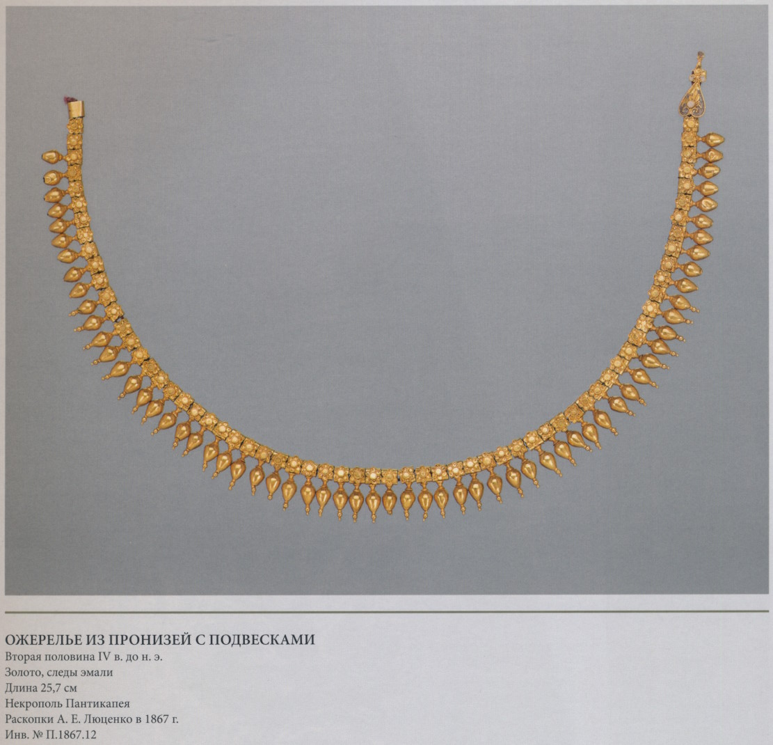 Ожерелье, нанизанное на две параллельные нити, как пронизи из Ольвии (с. 42), состоит из коробчатых пронизей, к которым присоединены зерновидные подвески (такие детали украшений можно рассматривать как символ благосостояния и плодовитости). Лицевая поверхность пронизей украшена дугами с волютами из зерни и филигранной розеткой с лепестками, заполненными синей и зелёной эмалью. Два звена с тиснёными пальметками служат окончаниями ожерелья.