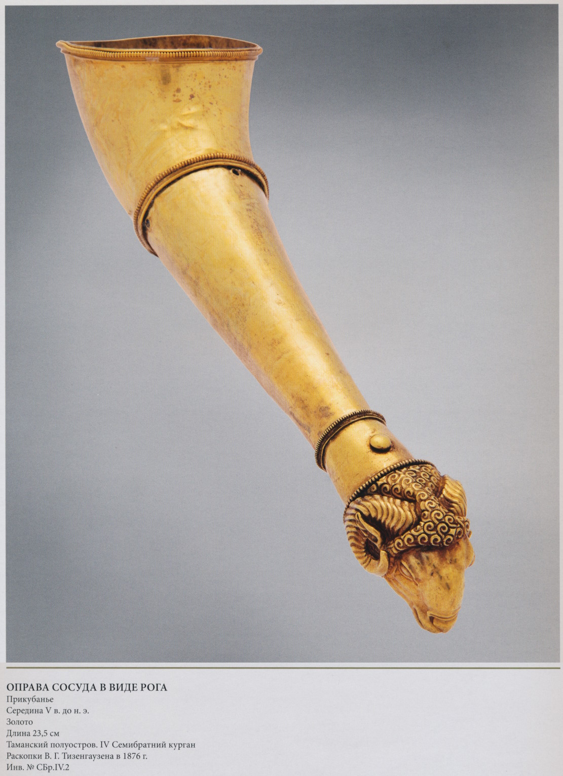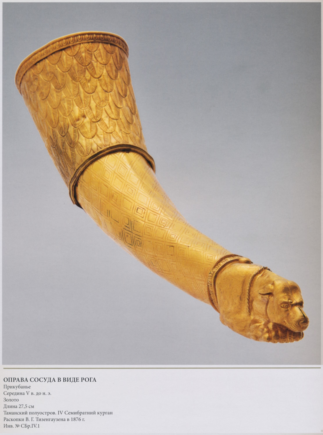 Изогнутая, сужающаяся книзу трубка заканчивается полуфигурой собаки с верёвочным ошейником, она состоит из двух вытисненных половинок, спаянных вместе. Оправа украшала нижнюю часть сосуда для питья, сделанного из рога, который закрепляли гвоздиками. В этом же погребении найдена оправа ещё одного сосуда такой же формы (с. 60). Подобные сосуды, судя по многочисленным изображениям, могли использоваться в ритуальной практике — при обращении к божеству либо при принесении клятвы (с. 132). По древним верованиям, отразившимся в фольклоре ираноязычных народов, собака отвращала злых демонов, участвовала в ритуалах очищения, сопровождала умерших к месту их нового пребывания. В древнеиранской мифологии спутниками первочеловека Йиму (Мифологический словарь 1991. С. 265) были четырёхглазые собаки, поэтому и в реальном мире особой магической силой наделялись собаки с парой круглых пятнышек белой или рыжей шерсти на лбу. У собаки на данном сосуде хорошо заметны выбитые пуансоном кружки над бровями: возможно, это было способом передать «четырёхглазость». (56/57) Представление о связи собаки с силами потустороннего мира отразилось в фольклоре европейских народов, а также в мифах и культовой практике греков (Шауб 2007. С. 103-108, 264). Сосуд-рог был известен и в обиходе греков: в отрывке из поэмы «Пир» поэта V-IV вв. до н.э. Филоксена (Philoxenus. 5) говорится, что «из рогов в золотых фигурных оправах пили нектар» (пер.авт.). Гравированный декор верхней части сосуда, покрытой, как ковром, сложными ромбами и перьевидным орнаментом, напоминает роспись аттической керамики группы «St.Valentin». Возможно, в выборе мотива узора, выполненного в греческой технике, отразилось представление о магической силе перьев орла или сокола в фольклоре ираноязычных народов.