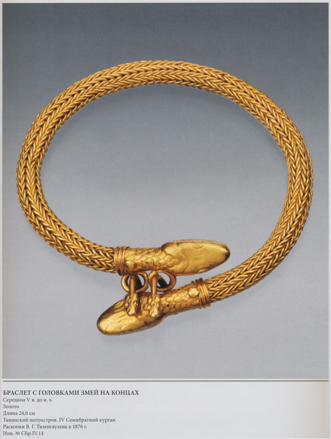Браслет из шнура с головками змей на концах. Шнур составлен из соединённых вместе цепочек со звеньями двойного переплетения. Головы змей литые, с глазами и чешуёй, проработанными чеканкой. Окончания браслета снабжены застёжкой из пары колечек и крючков, в свою очередь оканчивающихся миниатюрными головками змей. Изображение змеи во все времена считалось действенным амулетом. В Афинах такими амулетами охраняли детей (Еврипид. Ион, 24-26, 1427-1431).