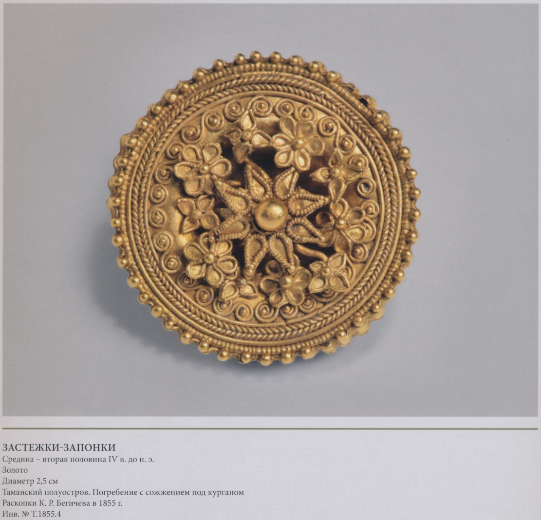 Средина — вторая половина IV в. до н.э. Золото. Диаметр 2,5 см. Таманский полуостров. Погребение с сожжением под курганом. Раскопки К.Р. Бегичева в 1855 г. Инв. №Т.1855.4.