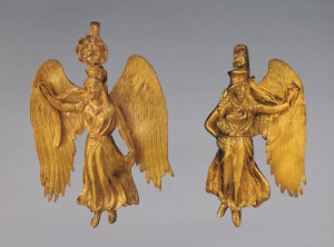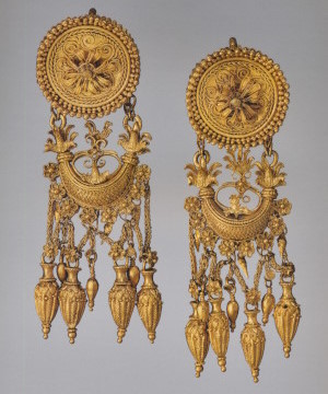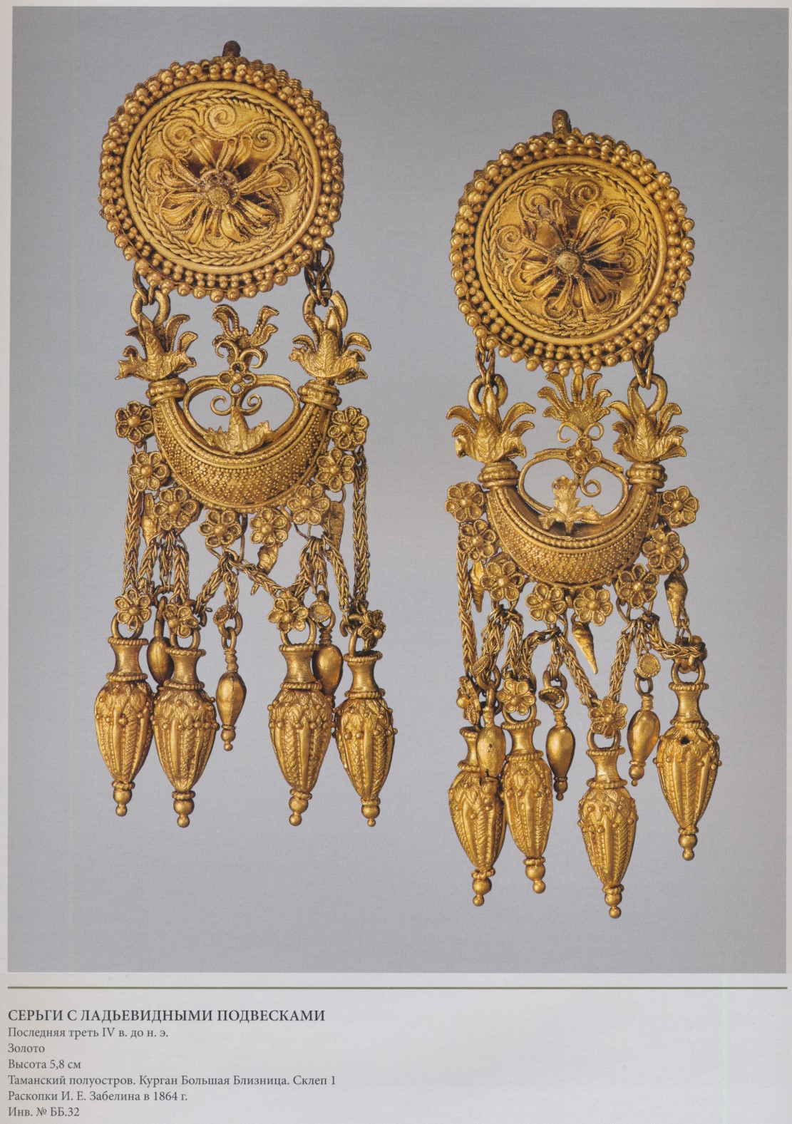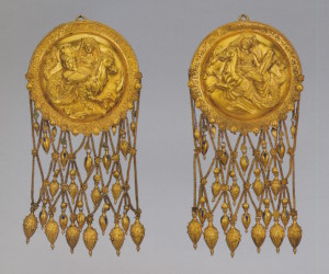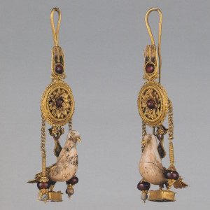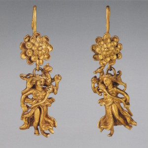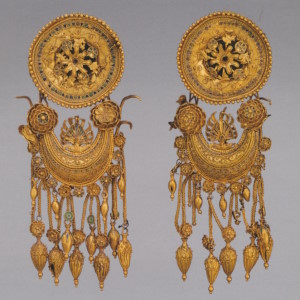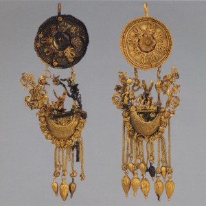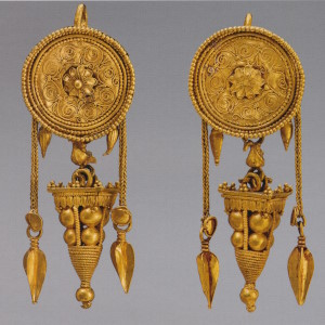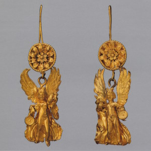 Пара серёг с дисками, украшенными розетками и филигранью, к которым подвешены фигурки крылатой Гебы с кувшином и фиалой в руках. Фигурки литые, руки с сосудами, крылья и плащ изготовлены отдельно. Геба, богиня юности, дочь Зевса и Геры, на пирах богов подносила нектар (до того как эти обязанности Зевс поручил похищенному им Ганимеду):