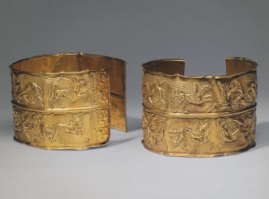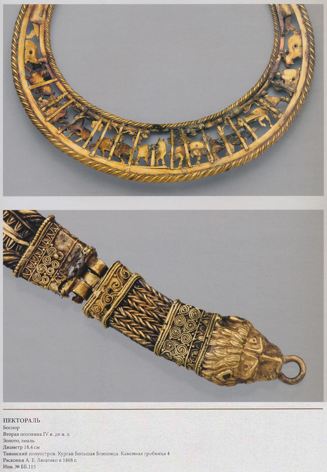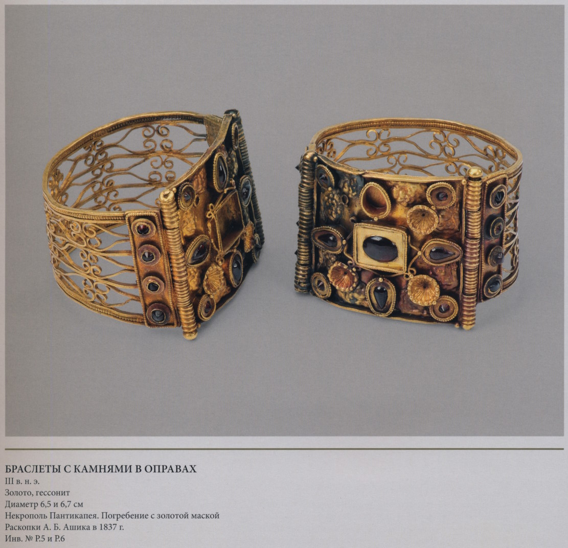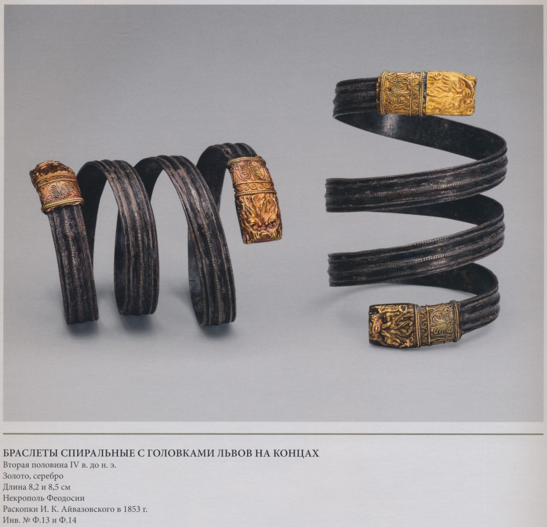 Два серебряных браслета с окончаниями в виде золотых львиных головок, спаянных из двух тисненых половинок. Детали рельефа доработаны чеканкой, втулки украшены филигранью и зернью. Зубы и языки были изготовлены отдельно и припаяны к готовым головкам. В глазу одного из львов сохранились следы киновари. На серебряной поверхности у втулок заметны слабые следы позолоты в виде остроугольных фестонов. Тип несомкнутого браслета с зооморфными окончаниями был заимствован греками из репертуара ближневосточного декоративного искусства и надолго стал излюбленной формой наручного украшения (с. 104, 122, 152, 172). Гармоничные пропорции и совершенство исполнения львиных голов ставят эти браслеты в ряд лучших украшений классической эпохи. Львиные головы на концах браслета могли служить оберегами: они как бы замыкали на запястиях магический круг, препятствуя возможному воздействию враждебных сил.