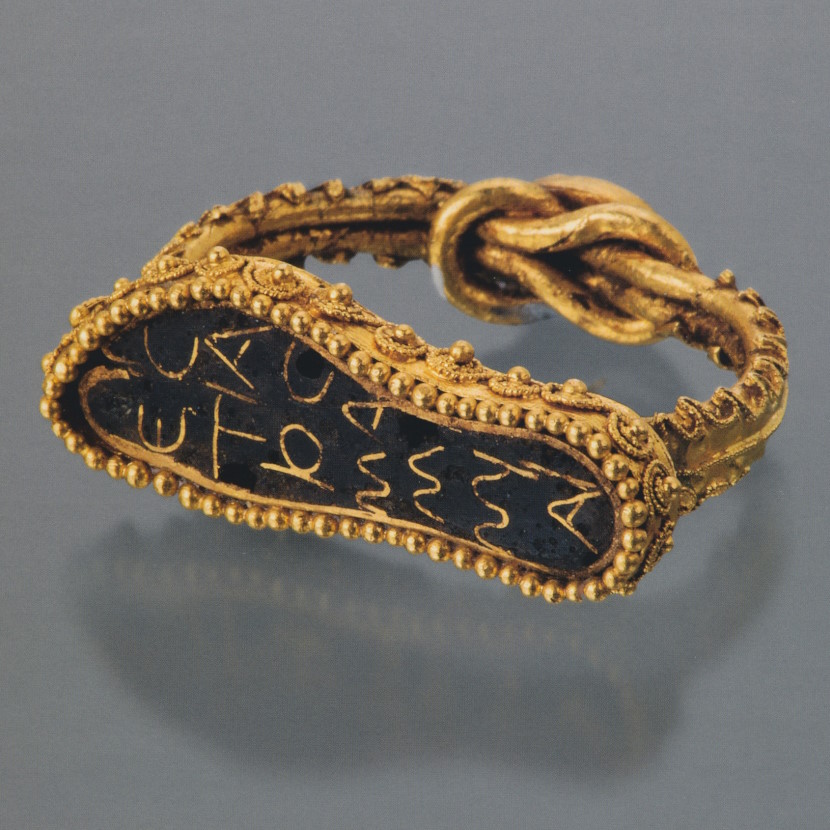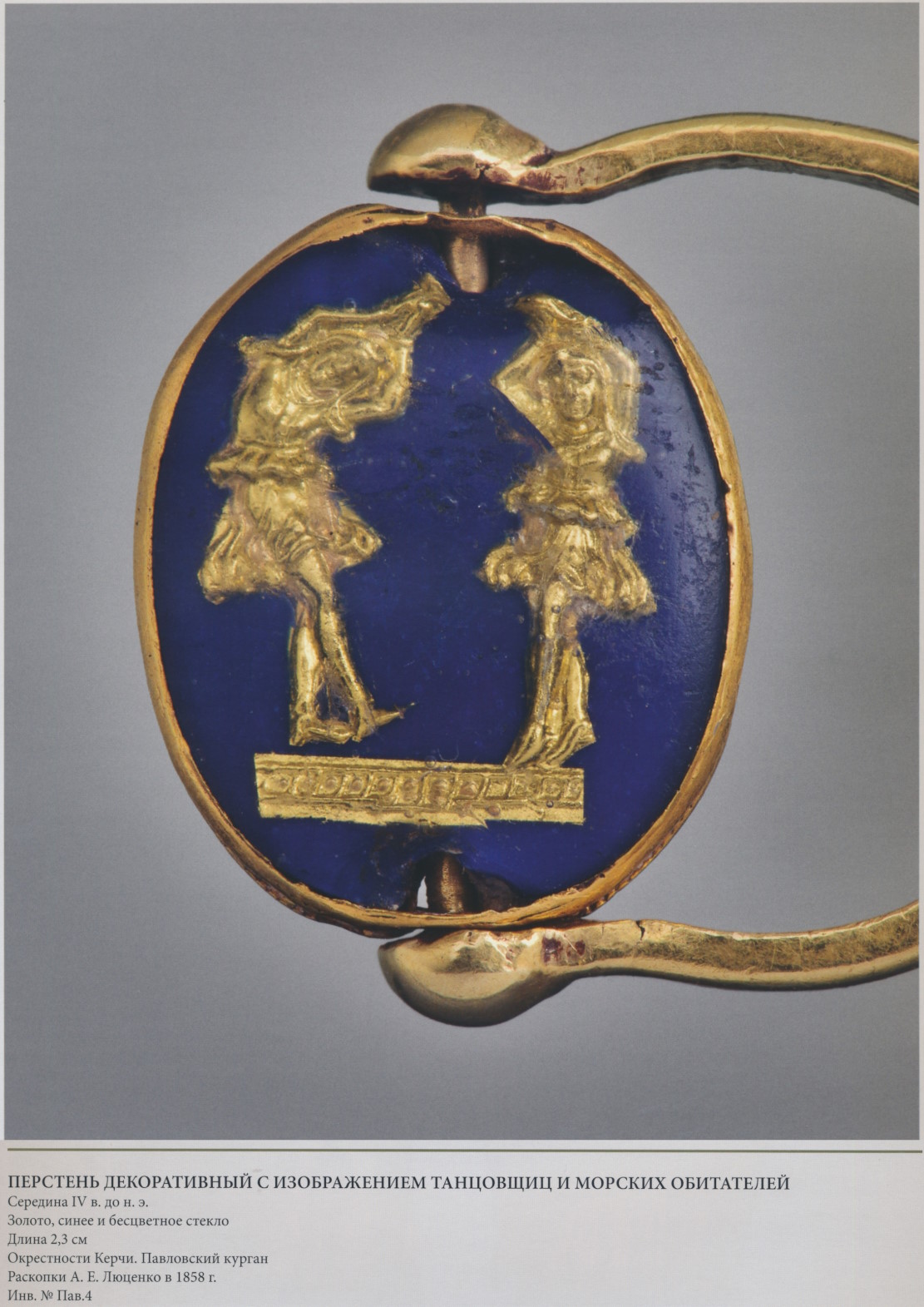 Дужка из двух проволок, украшенных филигранными полосками, завязана в центре геракловым узлом, в который вставлен альмандин. Гераклов узел, рассматривавшийся как магическое средство, часто включали в декор украшений (с. 210, 214, 220, 232, 250). Щиток, изготовленный в виде толстой подошвы сандалии, украшен по краю филигранью и зернью и заполнен стекловидной массой, кусочки которой вставлены между тонкими золотыми пластинками, образующими надпись: ECTIAIOC MAMMIAI — «Гестией (подарил) Маммии». Сопоставляя имена на перстне с именами боспорских надписей, М.И. Максимова признала весьма вероятным, что перстень сделан местным, скорее всего пантикапейским, мастером. Техника изготовления щитка очень близка к той, в которой исполнен медальон булавки (с. 254). Л.Э. Стефани, читая второе слово надписи как «матушка», комментировал форму щитка так: «Ввиду того общеизвестного употребления, какое греческие женщины обыкновенно делали из этой обуви не только по отношению к своим мужьям, но и главным образом при воспитании своих детей, перстень (248/249) подобной формы мог служить подарком, который сын подносил матери, желая, может быть, такою формою перстня напомнить ей о тщательном воспитании, данном ему, и таким образом выразить ей свою благодарность за это воспитание» (ОАК за 1880 г. С. 77, 78). Действительно, ввиду доступности такого средства воспитания, как сандалия, бывшего всегда под рукой, известный педагогический приём широко применяли не только среди людей, но и на Олимпе, где Афродита подобным образом вразумляла своего шустрого сына Эрота (Лукиан. Разговоры богов, XI, 1). В данном случае след ноги или отпечаток сандалии надо рассматривать скорее как знак присутствия божества, силы его воздействия и, следовательно, как доброе пожелание, аналогичное русскому «С богом!». В римскую эпоху исходя из таких же представлений след ступни оттискивали на дне краснолаковых чашек и тарелок, а золотые изображения отпечатков ступни служили приношениями в храм.