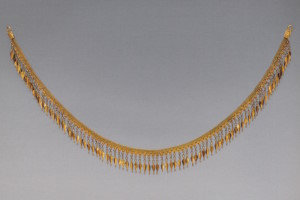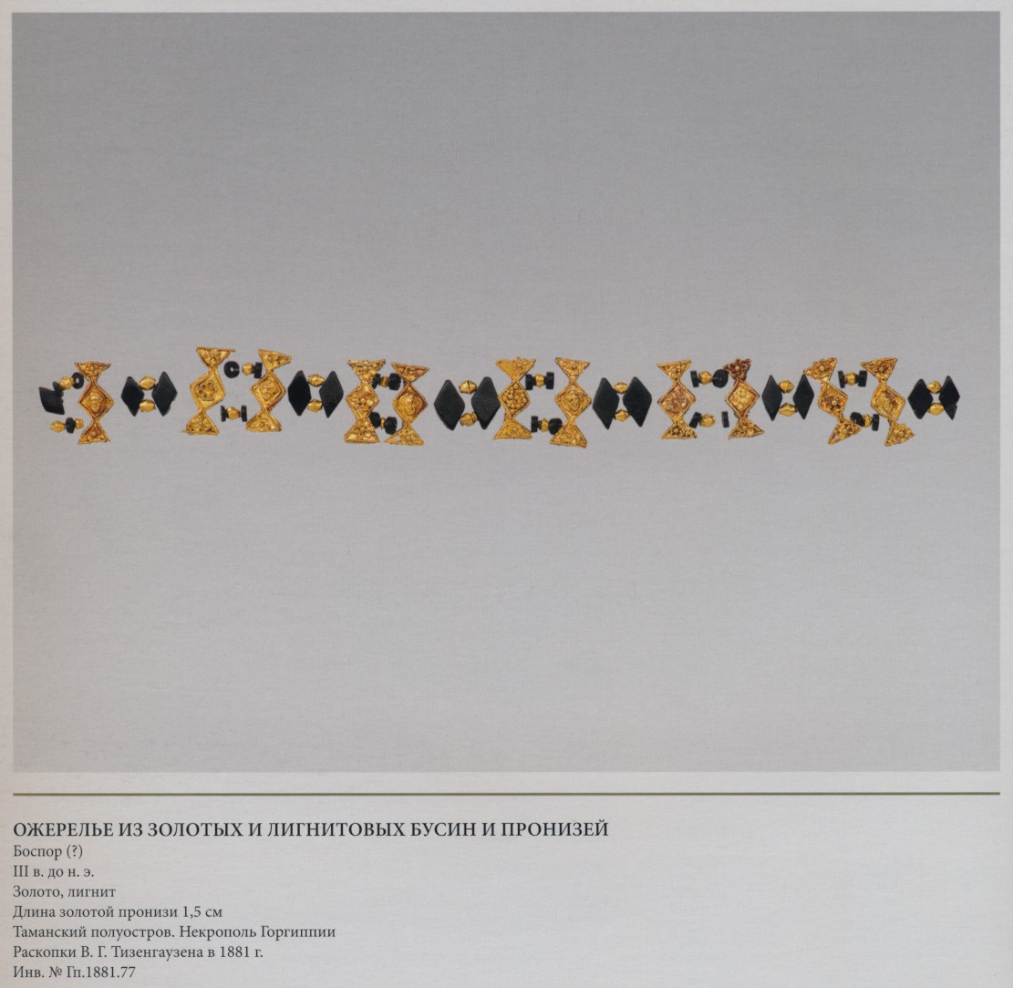 Двухрядное ожерелье (все золотые пронизи имеют по две петельки с обратной стороны, а лигнитовые — по два сквозных отверстия) составлено из одиннадцати золотых трёхчастных и тринадцати лигнитовых ромбических пронизей. В трёхчастных пронизях треугольники с филигранными розетками, а квадраты — с изображениями человеческих голов, розетками, зернью и её имитацией (с. 228). Пространство между пронизями заполнено мелкими золотыми и биконическими бусинами. Чередование матовых золотых и чёрных лигнитовых элементов довольно эффектно и необычно для времени, когда в украшениях царили яркие цвета.