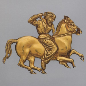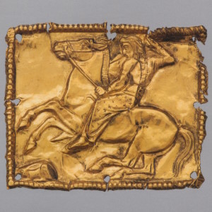 Изображение бога верхом на коне, издревле известное в Малой Азии, использовалось в греческом искусстве с V в. до н.э., в частности в сценах битвы и охоты. Сюжет пластинки близок к сложившейся под греческим влиянием композиции многочисленных памятников так называемого фракийского бога-всадника, культ которого был популярен в восточных провинциях Римской империи в первые века новой эры.