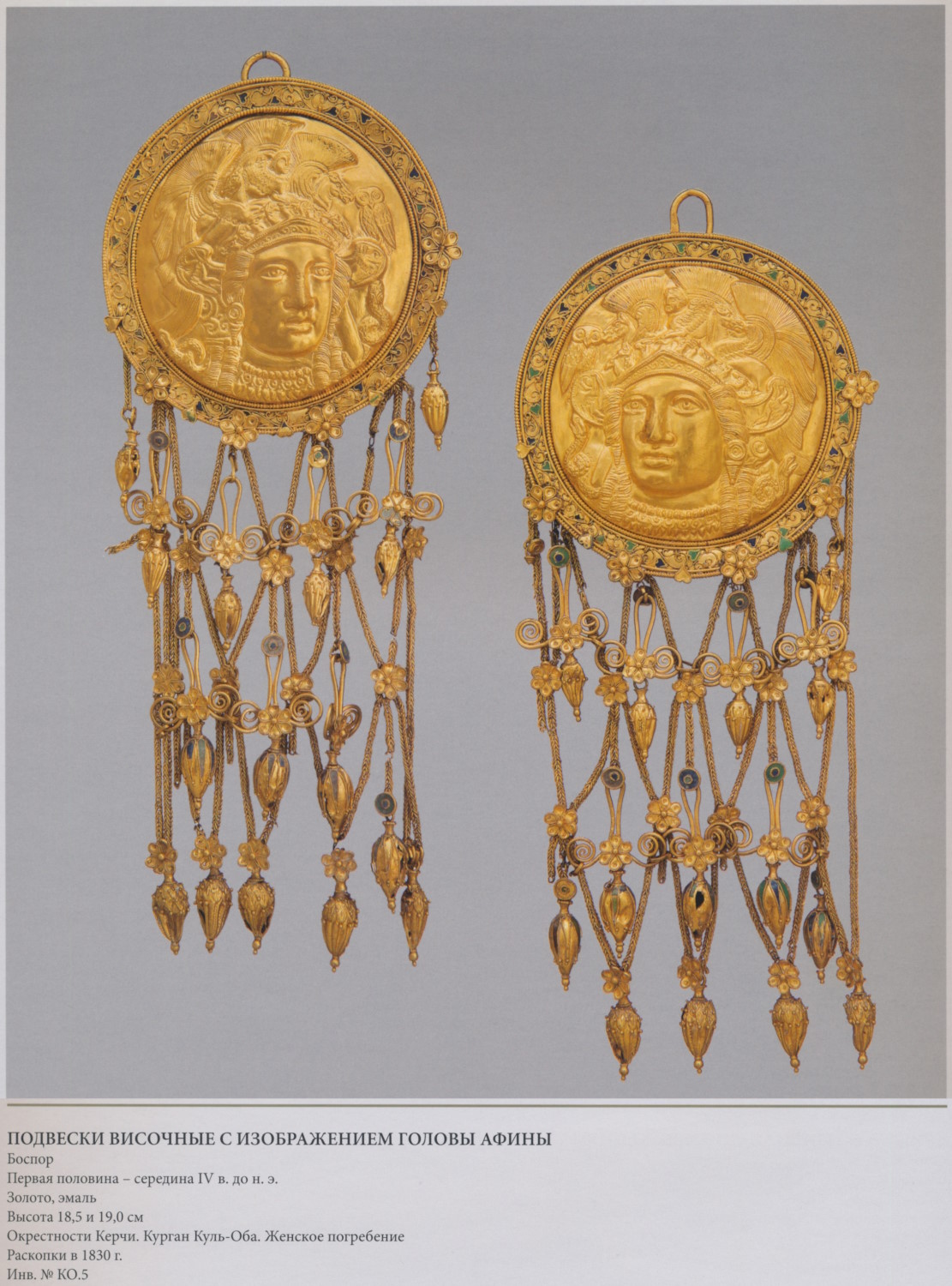 Конец V — начало IV в. до н.э. Золото, серебро, следы киновари. Диаметр 8,3 и 8,4 см. Некрополь Пантикапея. Раскопки А.Е. Люценко в 1854 г. Инв. №П.1854.28 и П.1854.29.