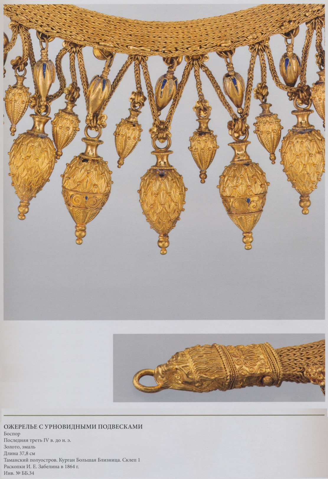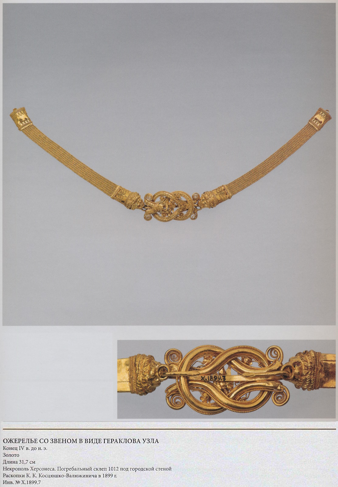 Низка из двадцати цилиндрических пронизей, к двум из которых припаяны звенья в виде гераклова узла из трубок, покрытых филигранью и оканчивающихся головками львов, в центре которых — тиснёная пластинка с изображением женской головы, как считается Медузы Горгоны. Неровный контур пластины, выражение лица, беспокойные линии волос придают рельефу «барочный» облик, свойственный многим произведениям эллинистического времени. Маска Медузы Горгоны, наложенная на узлы, должна была усиливать действие оберега. И.И. Саверкина, отметившая на лбу у одной из голов рожки, назвала её Ио (Zwei Gesichter der Eremitage 1997. S. 153). Ио, превращённая ревнивой Герой в корову за любовь к ней Зевса, претерпела многие страдания, но в конце концов стала матерью героя Эпафа, поэтому в этих медальонах можно видеть не просто амулет, а, подобно изображению Данаи на перстне из Ольвии (с. 52), намёк на богоизбранность. В набор, кроме того, входили подвески-амулеты: играющий на свирели Пан, лежащий лев, двухсторонний обоюдоострый топор — лабрис (древний символ (232/233/234) Великой богини природы; Андреев 2002. С. 446) или гребень, заяц, голубь. Подвески на цепочках в виде плодов граната (один из символов плодородия) окружали гераклов узел. Как апотропеический символ, он часто соединялся с другими амулетами. Цилиндрические пронизи, напоминающие черенки веток с нераспустившейся почкой у одного из междуузлий, встречаются в подобных наборах из других мест Греции (Amandry 1953. Р. 85. Pl. XXXIII). Они, возможно, воспроизводят палочки, применявшиеся для гадания у разных народов, в том числе у скифов (Геродот. IV, 67); в одном из скифских курганов найдены пучки прутьев, предположительно гадальных, правда, длиной около полуметра.