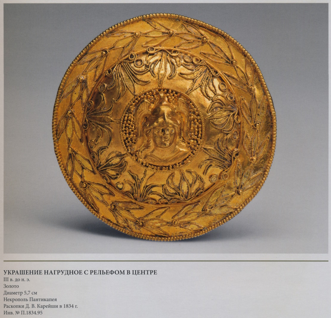 Третья четверть II в. до н.э. Золото, альмандин, стеклянная паста. Диаметр 20,0 см. Таманский полуостров Артюховский курган. Раскопки С.И. Веребрюсова в 1879 г. Инв №Арт.1.
