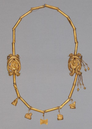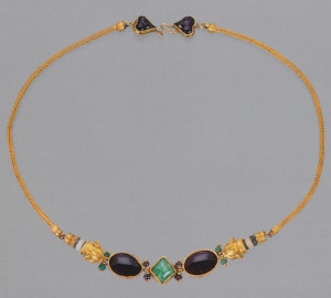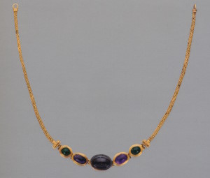 Центральную часть ожерелья составляют квадратный берилл и два овальных альмандина в оправах. Два отрезка золотого шнура из мелких колечек прикреплены к ним головками рысей на втулках из стеклянной пасты, имитирующей сардоникс. Застёжка, состоящая из крючка и петли, припаяна к гнёздам с альмандиновыми вставками в виде листьев плюща. Основной эффект производила яркая композиция из цветных камней в центре ожерелья, тогда как золоту отведена вспомогательная роль. Оправы камней и головок рысей соединены между собой шарнирами, оси которых украшены мелкими бусинами из альмандина и берилла. Ожерелья этого типа изготавливали и в первые века новой эры (с. 256, 258).