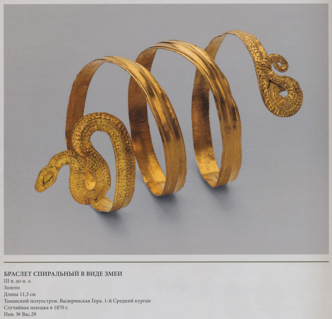 Спиральный браслет в виде свернувшейся змеи спаян из двух полосок золотого листа: внутренней гладкой и наружной профилированной. На голове змеи — пустое гнездо от выпавшего в древности камня. Чешуя показана чеканкой только на голове и хвосте змеи, тогда как её тело представлено в виде полосы с тремя продольными рёбрами, характерными для плоских браслетов несколько более раннего времени (с. 100, 194); в данном случае такой приём, вероятно, позволял избежать натурализма.
