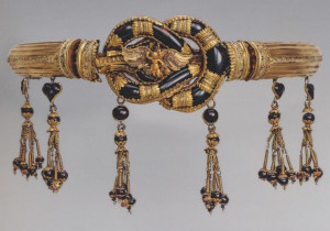 Третья четверть II в. до н.э. Золото, альмандин, янтарь, эмаль. Длина 47,5 см. Таманский полуостров. Артюховский курган. Раскопки С.И. Веребрюсова в 1879 г. Инв. №Арт.5.