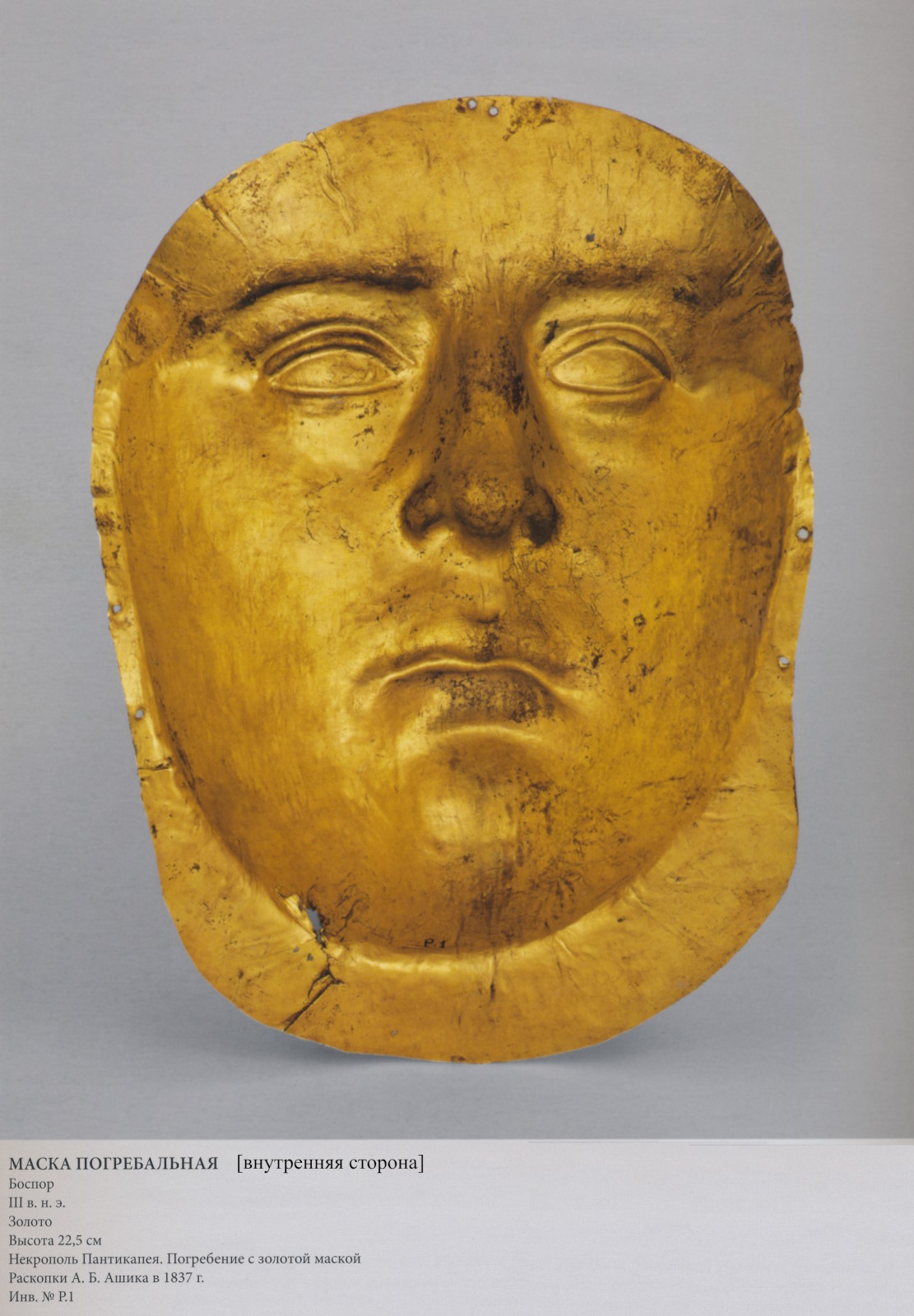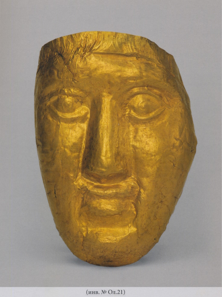 Маска — часть инвентаря богатого погребения в мраморном саркофаге, открытого на окраине Керчи, в могиле под высокой курганной насыпью. Она лежала на черепе, проделанные по краям отверстия позволяли прикрепить её к погребальному покрову, расшитому мелкими золотыми бляшками. Маска изготовлена из золотого листа, на внутренней стороне которого видны следы ковки. Лист был наложен на модель, сделанную из материала, достаточно твёрдого, чтобы выдержать удары молотка. В ходе работы сначала проявлялись крупные и выступающие черты, а подробности рельефа лица проступали по мере дальнейшей притирки листа к поверхности модели. Прокладка из ткани (её отпечатки сохранились местами на внутренней стороне маски) смягчала удары молотка и уменьшала повреждения и портрета, и листа, но всё же при этом возникали огрехи: в некоторых местах истончившийся лист прорывался, в других (вокруг носа, у шеи) образовывались заломы и складки. Правильное с точки зрения анатомии построение этой маски предполагает использование в качестве модели скульптурного портрета — в неплохом (262/263) качестве оригинала убеждает взгляд на внутреннюю сторону маски (с. 264). Поскольку золотой лист, толщина которого местами достигает 0,5 мм, и мягкая ткань сгладили детали моделировки скульптурного оригинала, черты лица на наружной стороне маски вышли размытыми и безжизненными, что затрудняет её гендерное определение. Сопровождающие костяк вещи, в особенности золотые серьги, флакон, позолоченное веретено и бусы, свидетельствуют о принадлежности погребения женщине, хотя найденные там же браслеты (с. 266) могли принадлежать и мужчине. Положенные в саркофаг два набора конской упряжи также привычно ассоциируются с мужским обиходом. Это породило разнобой в определении пола погребённого (Тайна золотой маски 2009. С. 30-33). Маски встречались в погребальном обряде многих обществ в разные эпохи — достаточно вспомнить маски в Египте, Микенах, Южной Сибири, а в первые века новой эры — на таких окраинах Древнего мира, как Передний Восток или Фракия. Для Боспора эта находка остаётся уникальной, хотя в некоторых местах Северного Причерноморья (263/264) существовал обычай тем или иным способом закрывать лицо умершего. Во II-I вв. до н.э. в мавзолее Неаполя Скифского, столицы государства поздних скифов в Крыму, и в некоторых других позднескифских могильниках находили лицевые пластины, прикрывавшие глаза и рот погребённых, что практиковалось в ту эпоху в Парфии и в других местах Ближнего Востока (в частности, в некрополе на острове Тилос в Персидском заливе). На протяжении первых веков новой эры такой обычай существовал в состоятельных семьях Херсонеса (инв. №Х.1910.46 и Х.1910.6 – с. 265) и, в меньшей степени, в Ольвии (о лицевых пластинах см.: Пятышева 1956. С. 29-41. Табл. V). Кроме того, вблизи Ольвии была найдена золотая маска, в целом верно, хотя и схематично, передающая черты человеческого лица (инв. №Ол.21 [с. 265]). В погребальном обряде роль маски могла быть многообразной, но не обязательно портретом. Она «замещала» лицо, уже изменившееся к моменту погребения, при этом обозначая «нездешнее», загробное состояние умершей персоны, новый статус которой подтверждался, кроме того, венком, подобным другому из Пантикапея (с. 260). Особенный, уникальный вид данной маски отражал высокий социальный статус погребения; в то же врем